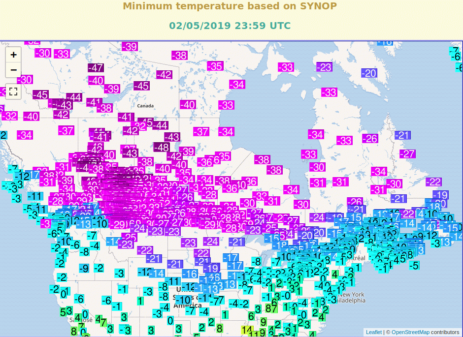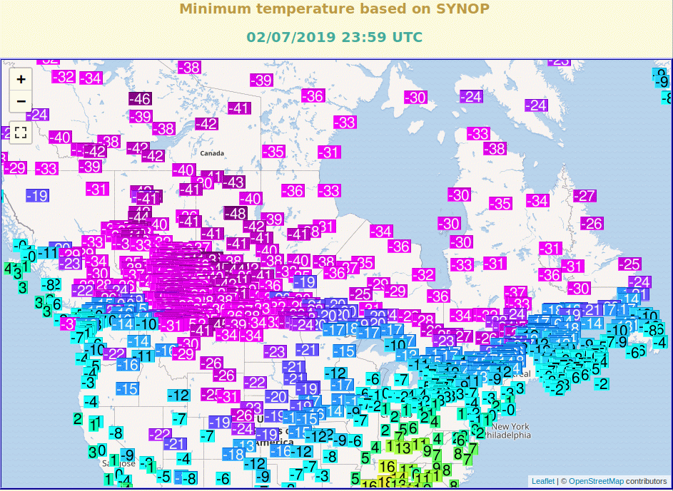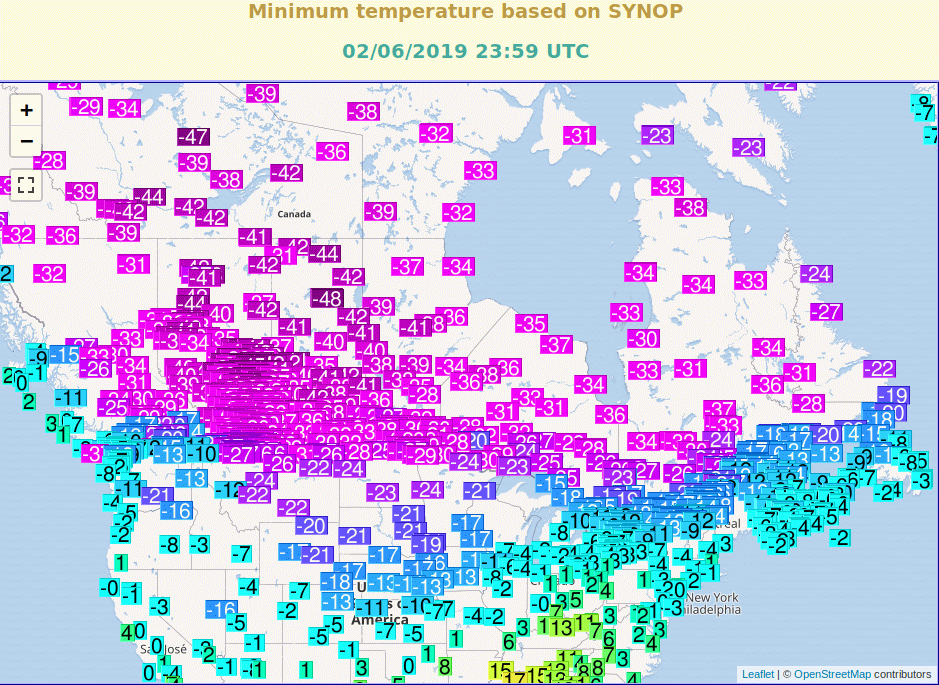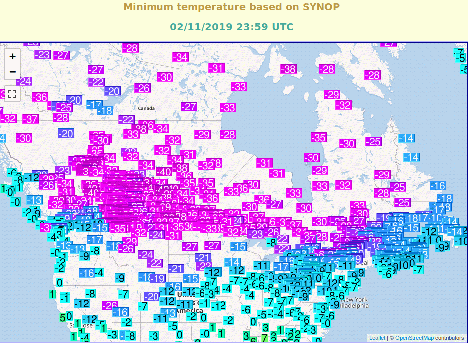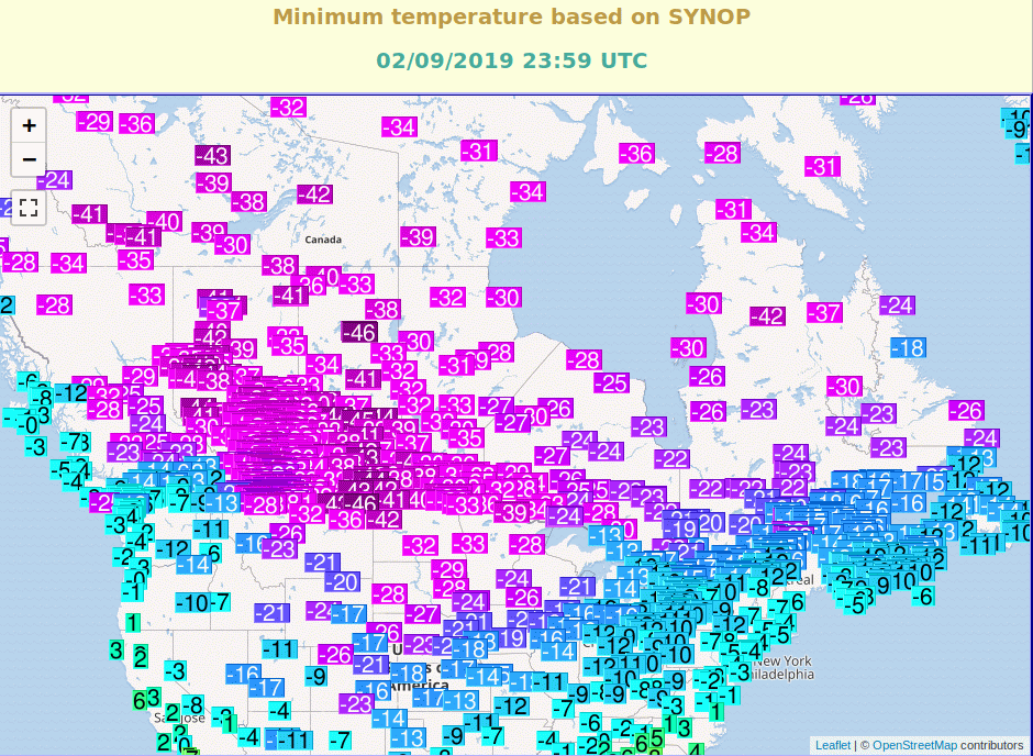 Jako extrem tam udadeji pro USA tam je uvedeno International Falls 27.01.2019 -43.3 °C (-46 °F), oproti Cotton, Minnesota 27.01.2019 a 31.01.2019 -48.9 °C (-56 °F), asi jsou data tentokrat jen z hlavnich (SYNOP) stanic v clanku. Dale pak v Kanade pobliz hranic s Montanou Coronach, Saskatchewan 07.02.2019 -46.5°C (-51.7 °F) a naposled Elk Park v Montane 02.03.2019 -43.3 °C (-46 °F), coz by byl rekrdni mraz pro Montanu pro brezen.
