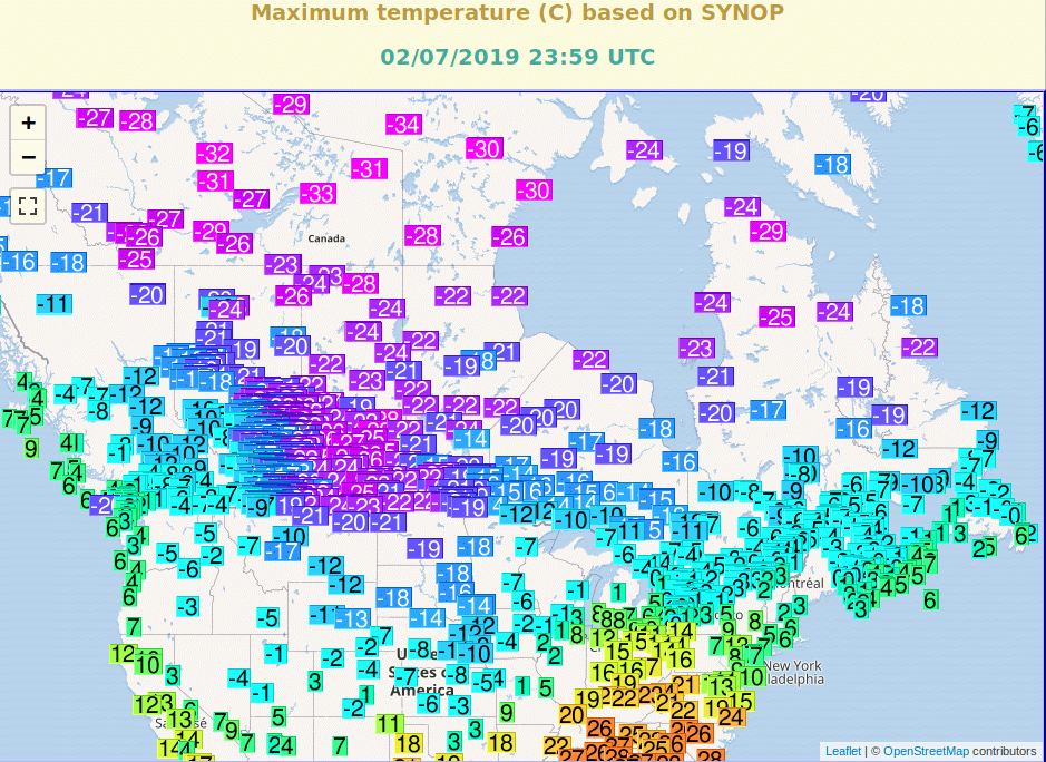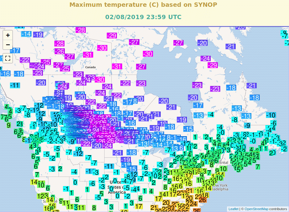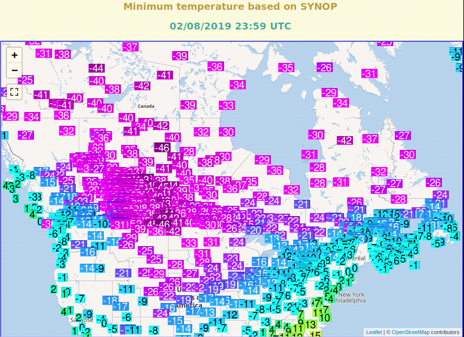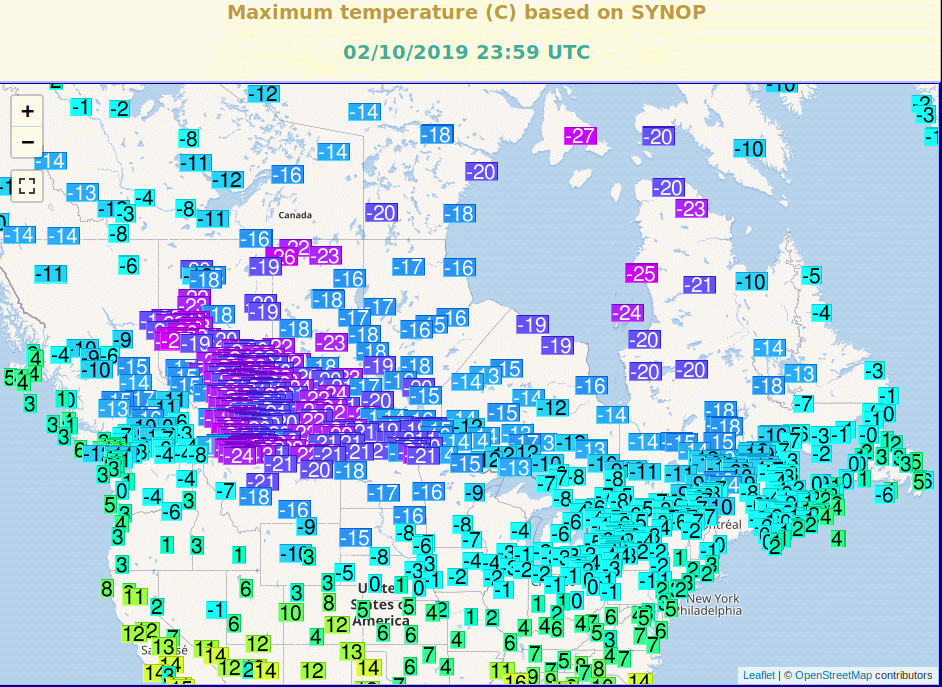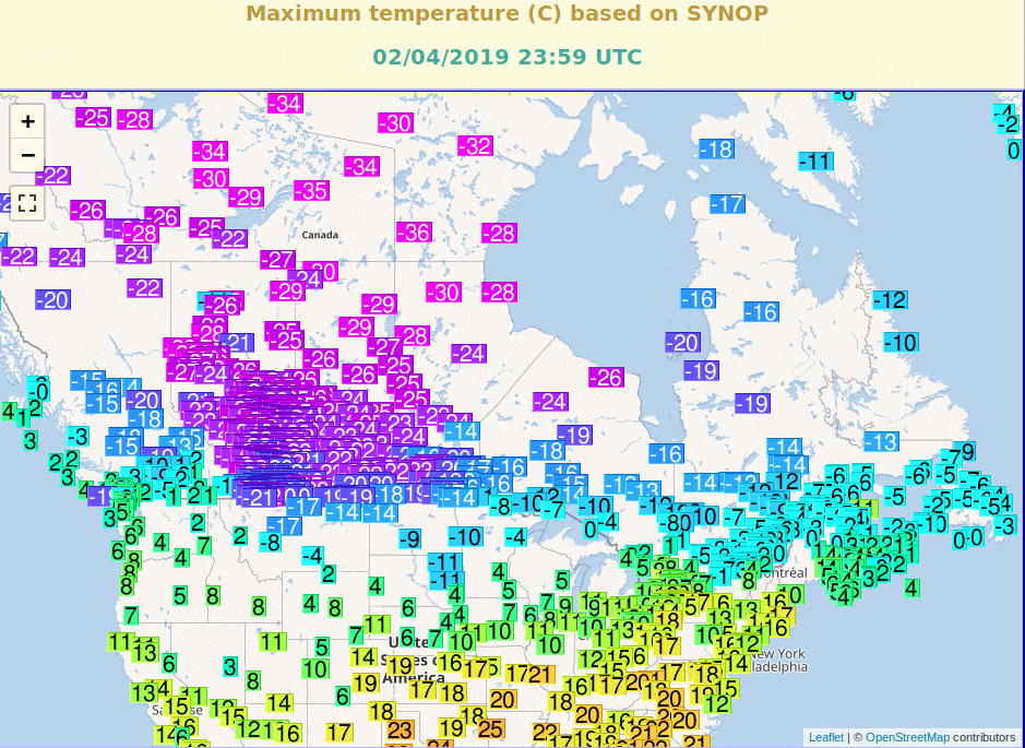 Jako extrem tam udadeji pro USA tam je uvedeno International Falls 27.01.2019 -43.3 °C (-46 °F), oproti Cotton, Minnesota 27.01.2019 a 31.01.2019 -48.9 °C (-56 °F), asi jsou data tentokrat jen z hlavnich (SYNOP) stanic v clanku. Dale pak v Kanade pobliz hranic s Montanou Coronach, Saskatchewan 07.02.2019 -46.5°C (-51.7 °F) a naposled Elk Park v Montane 02.03.2019 -43.3 °C (-46 °F), coz by byl rekrdni mraz pro Montanu pro brezen.