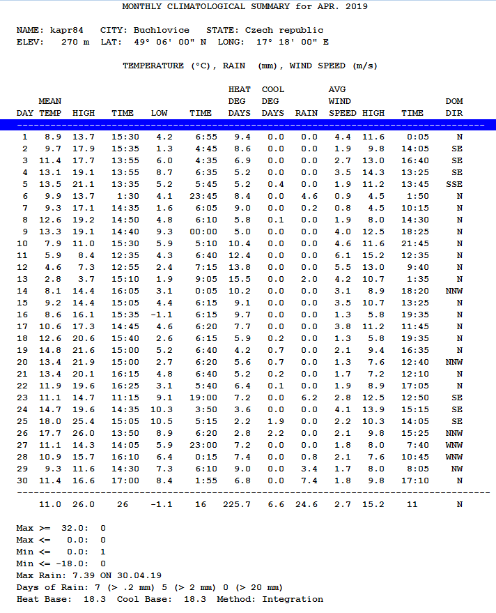 - absolutně nejvyšší teplota byla dosažena dne 26.4. + 26,10°C v 15:03 SELČ