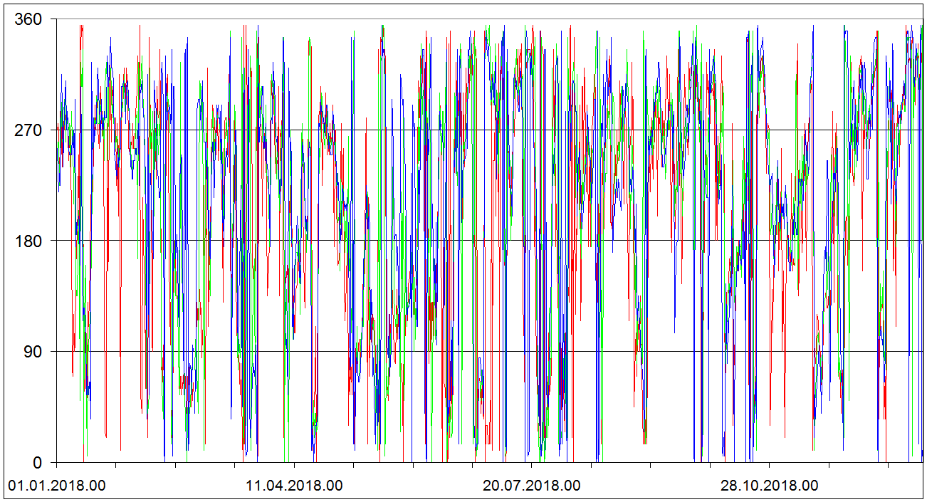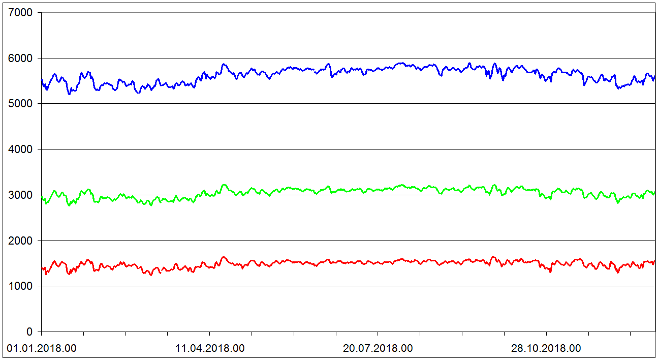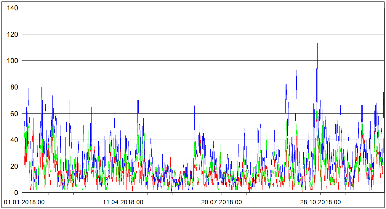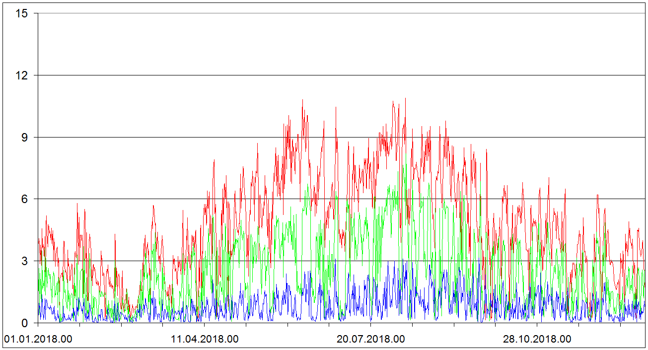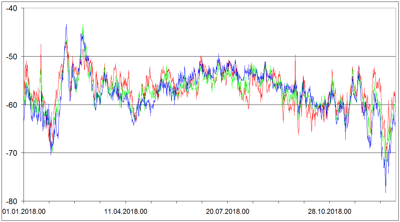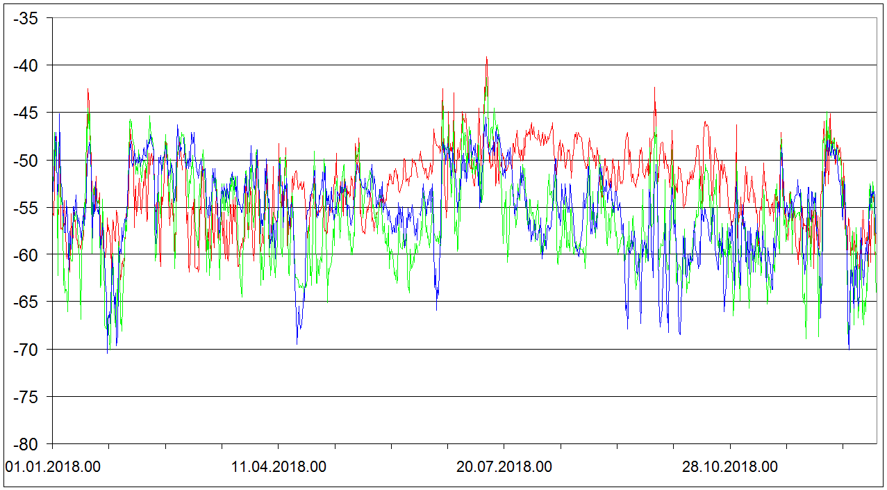 Sondaze Praha Libus 2018 - hodnoty velicin v hladine 850 cervene, 700 hPa zelene, 500 hPa modre. Jedna se o graf ze vsech 1095 sondazi (kazdy den 00 06 12 UTC). V nekterych terminech muzou nektere hodnoty chybet.