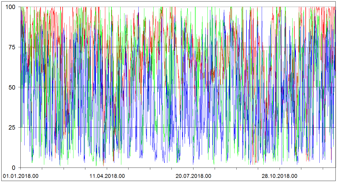 Sondaze Praha Libus 2018 - hodnoty velicin v hladine [red]850 cervene[/red], [green]700 hPa zelene[/green], [blue]500 hPa modre[/blue]. Jedna se o graf ze vsech 1095 sondazi (kazdy den 00 06 12 UTC). V nekterych terminech muzou nektere hodnoty chybet.