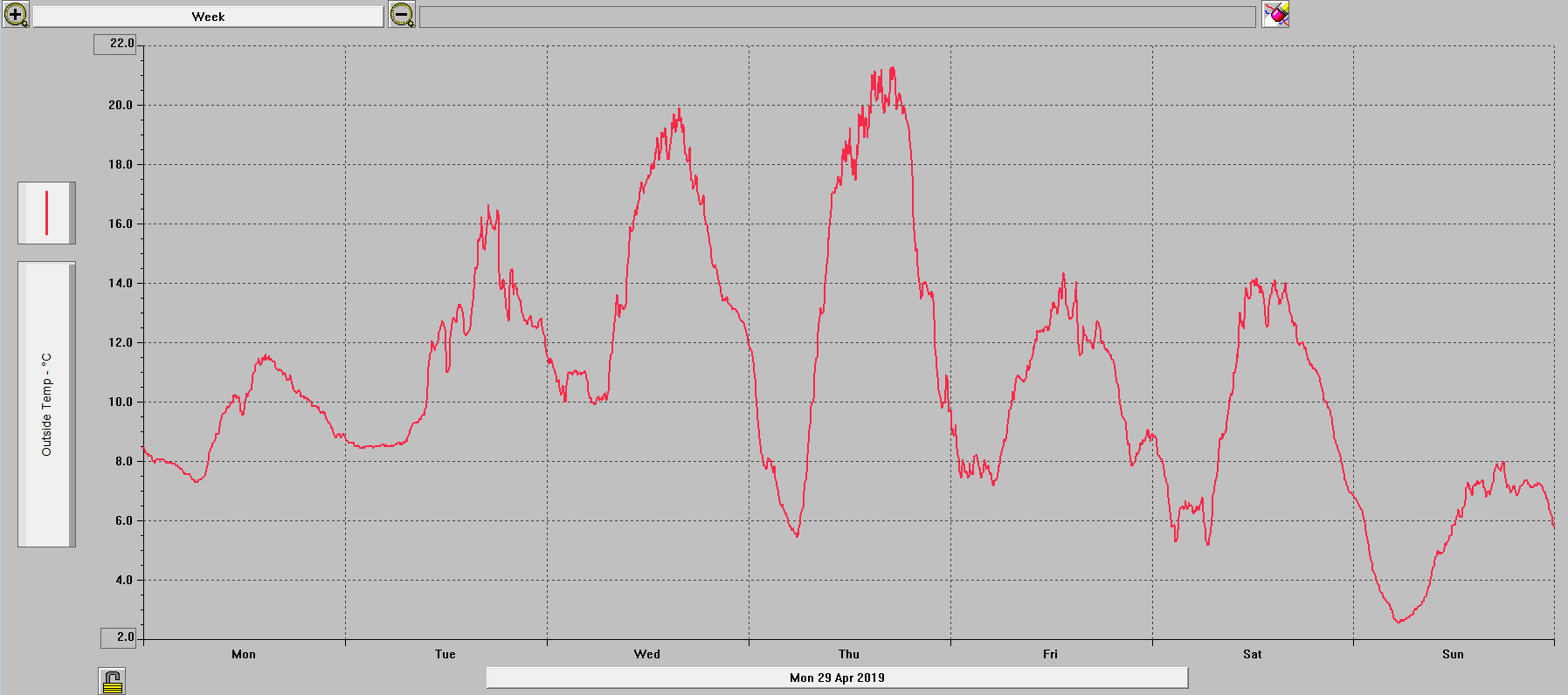 Včerejší průměrná teplota: 7,9 °C (8+15+2*22/4)/ 7,2 °C (5 minutová měření)