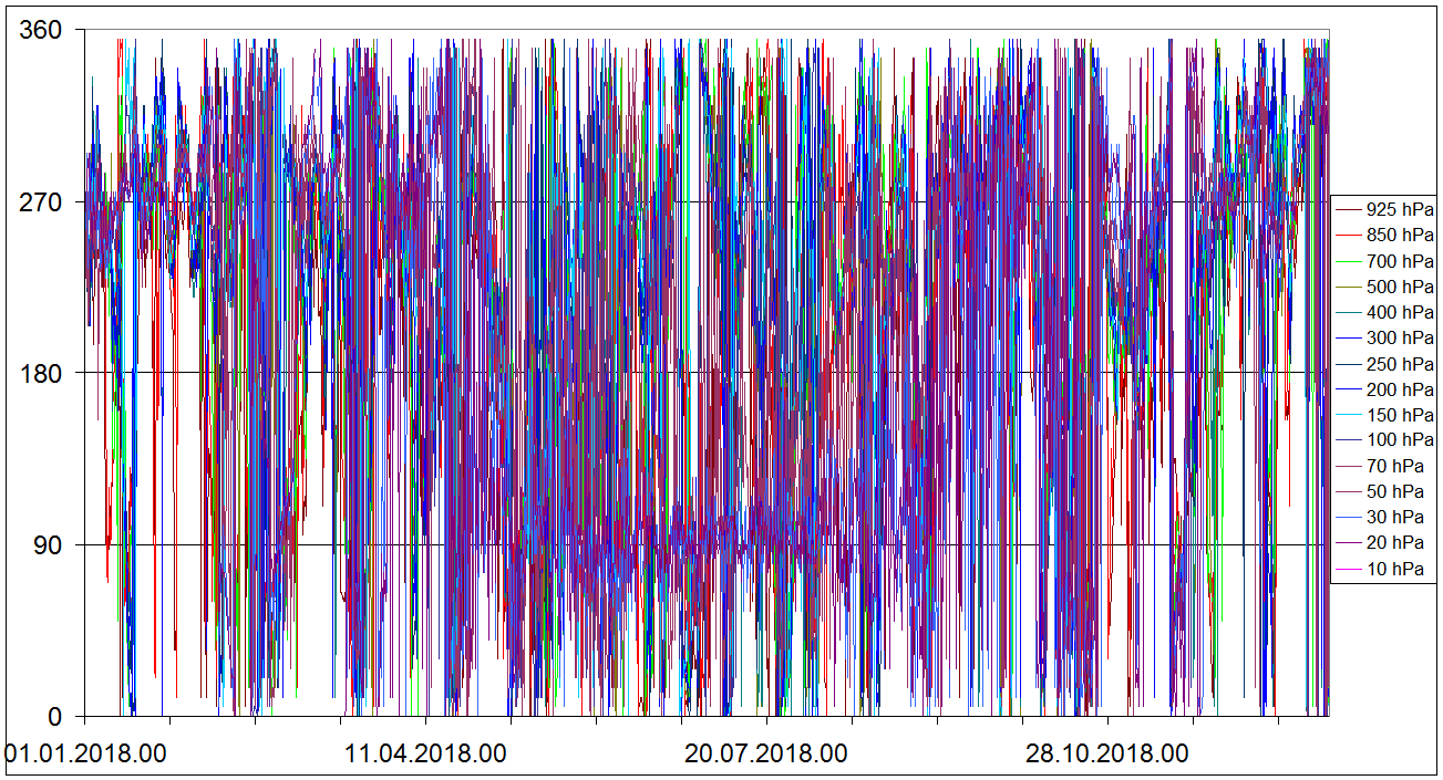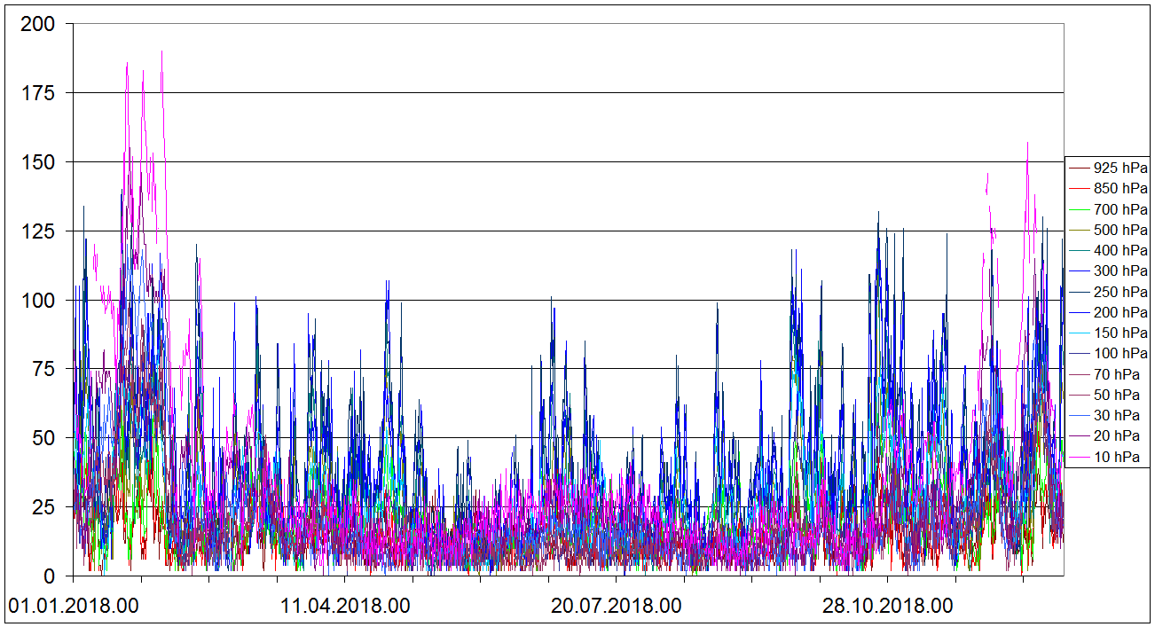 Sondaze Praha Libus 2018 - hodnoty velicin v 15 standardnich hladinach - 925 hPa, 850 hPa, 700 hPa, 500 hPa, 400 hPa, 300 hPa, 250 hPa, 200 hPa, 150 hPa, 100 hPa, 70 hPa, 50 hPa, 30 hPa, 20 hPa, 10 hPa. Jedna se o graf ze vsech 1095 sondazi (kazdy den 00 06 12 UTC). V nekterych terminech muzou nektere hodnoty chybet, a to zejmena ve vyssich hladinach, nejcasteji chybi hodnota v 10 hPa, v 10 hPa nemam smer vetru.
