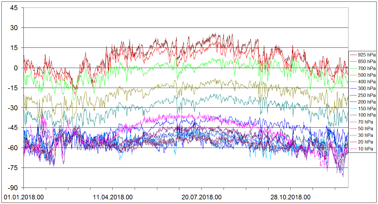 Sondaze Praha Libus 2018 - hodnoty velicin v 15 standardnich hladinach - 925 hPa, 850 hPa, 700 hPa, 500 hPa, 400 hPa, 300 hPa, 250 hPa, 200 hPa, 150 hPa, 100 hPa, 70 hPa, 50 hPa, 30 hPa, 20 hPa, 10 hPa. Jedna se o graf ze vsech 1095 sondazi (kazdy den 00 06 12 UTC). V nekterych terminech muzou nektere hodnoty chybet, a to zejmena ve vyssich hladinach, nejcasteji chybi hodnota v 10 hPa, v 10 hPa nemam smer vetru.