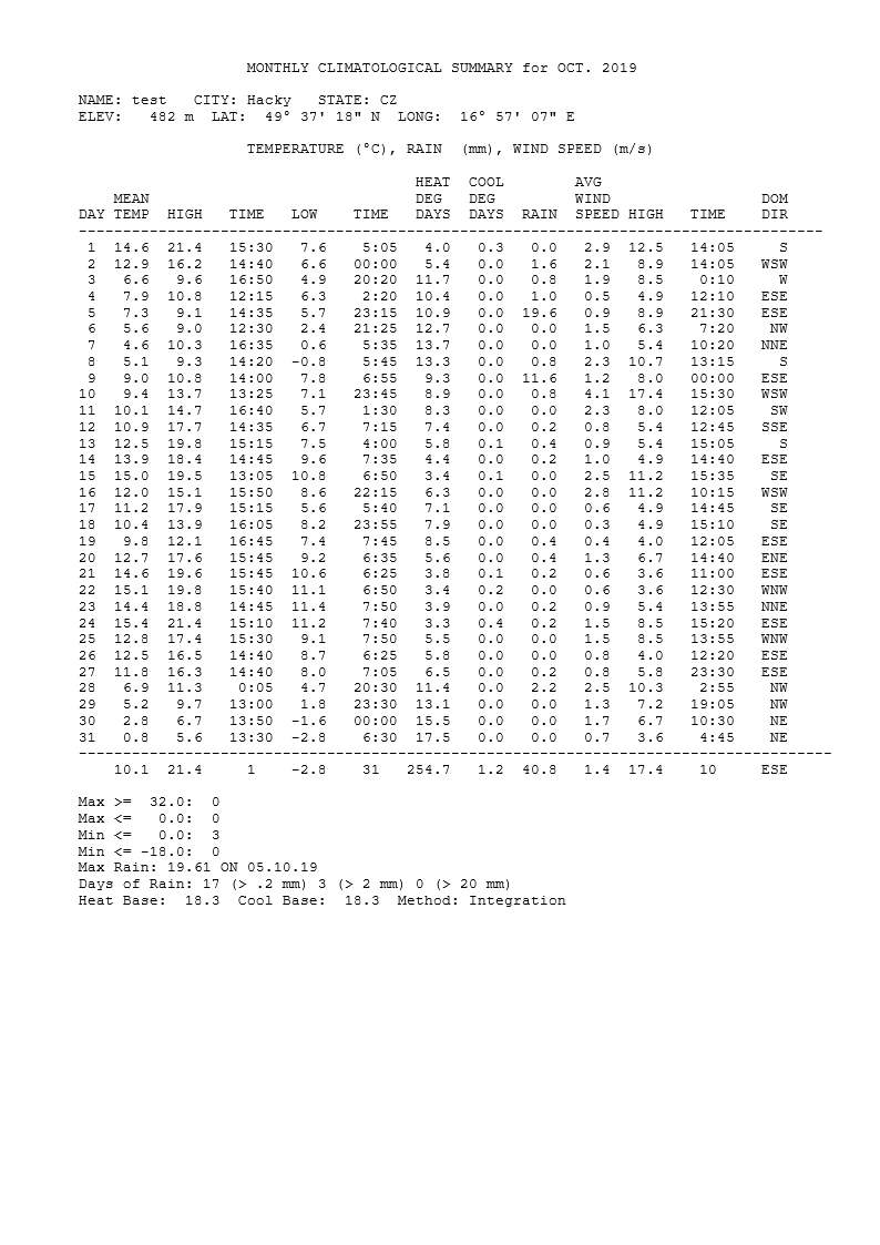 Nejteplejší den: 15.; 18,1 °C/ 15.; 17,9 °C (průměr 7+14+2*21/ 5 minut)