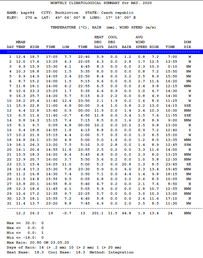 - absolutně nejvyšší teplota byla dosažena dne 19.5. + 24,2°C v 15:17 SELČ