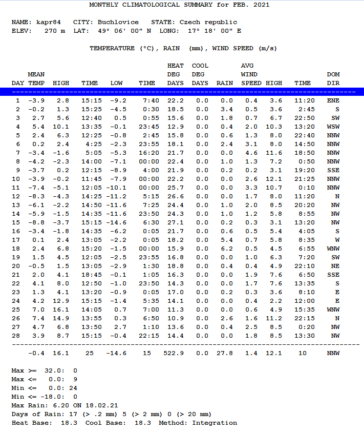 - absolutně nejnižší teplota byla dosažena 14.2. - 20,1°C v 5:39 SEČ