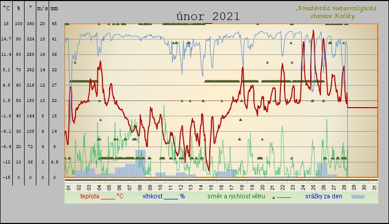 - absolutně nejvyšší teplota byla dosažena dne 24.2. + 15,1°C ve 14:29 SEČ
