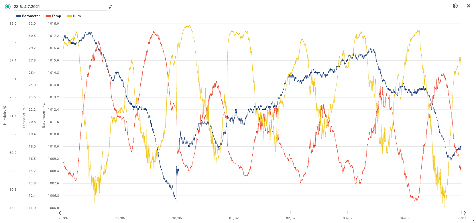 Minimální tlak za 24h: 1008,9 hPa (30.6.; 17:35)