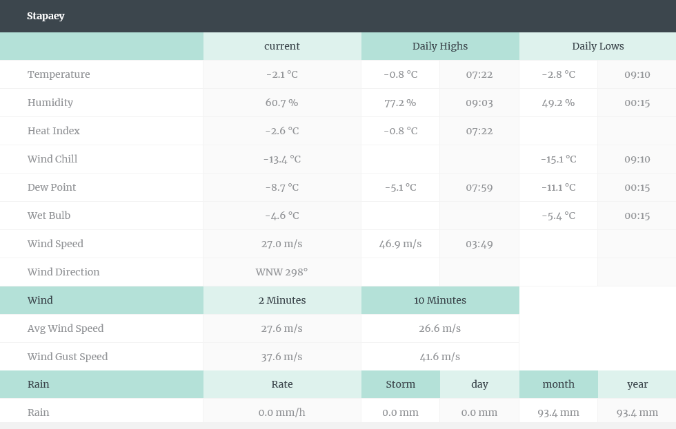 Skoro zataženo, 7/8, sc; teplota ve 2 m 5,2 °C; rosný bod -1,5 °C; relativní vlhkost vzduchu 62,0 %; vítr Z 7,1 m/s s nárazem 13,9 m/s; tlak vzduchu, přepočtený na hladinu moře 1014,6 hPa, mírný pokles->slabý vzestup; solární radiace 38 W/m2; THSW index -0,6 °C; přízemní teplota 4,4 °C.