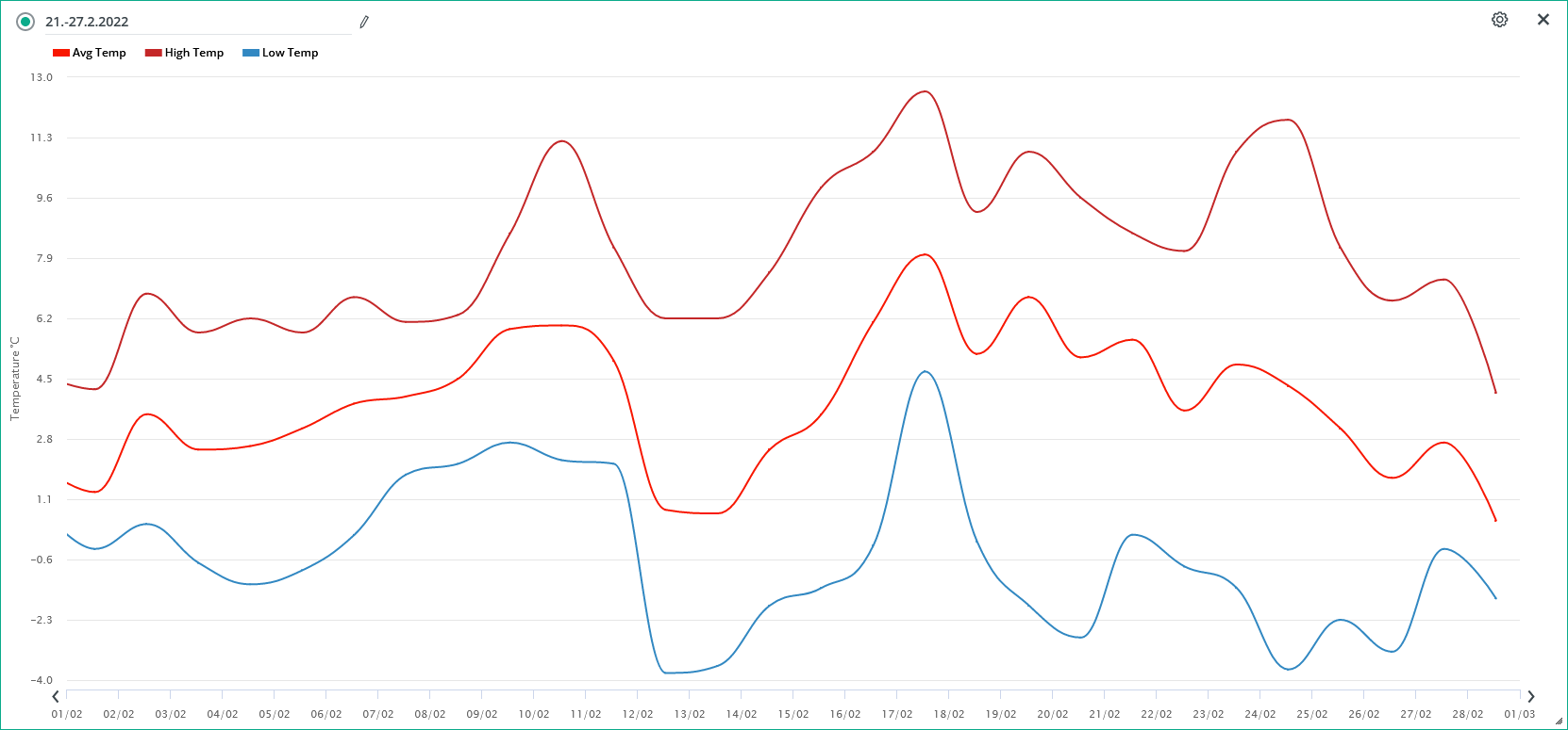 Prumer dennich maxim +8.09 °C (17. unora +12.7 °C, 1. unora +2.9 °C) Prumerna denni amplituda teploty (Tmax-Tmin) je 6.90 °C.