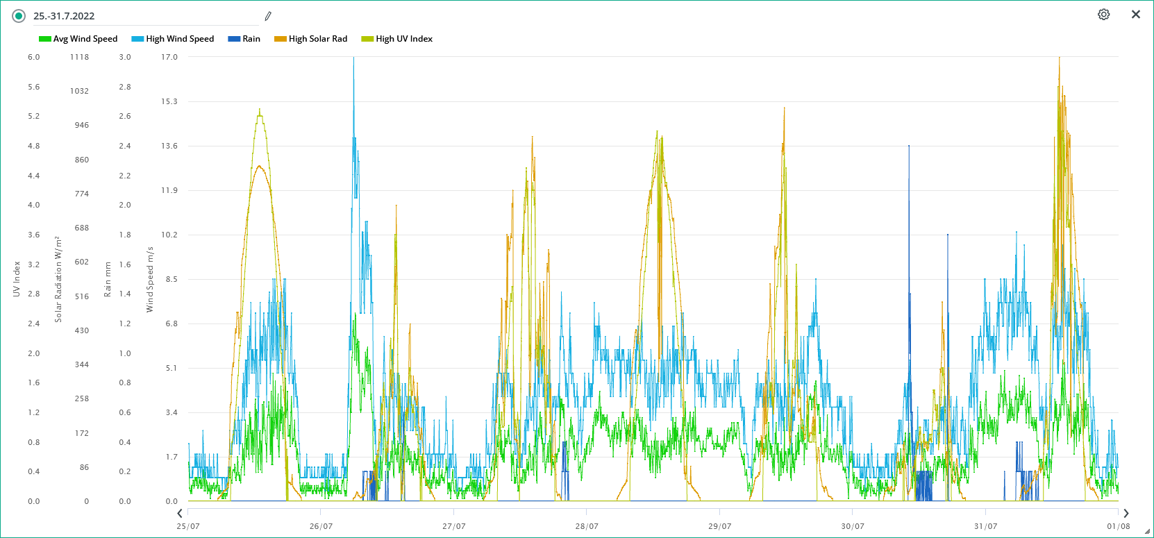 Průměrná rychlost větru 31.7./ max. rychlost.: 3,4 m/s (SZ)/ 12,1 m/s (ZSZ) 12:30