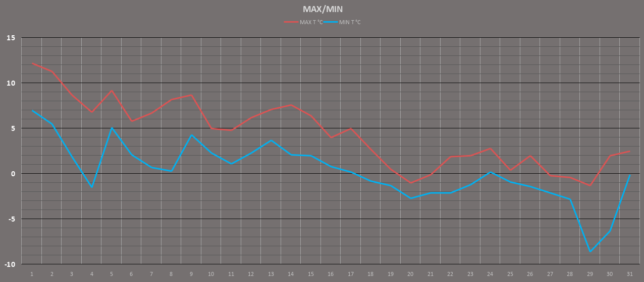 - nejchladnějším dnem byl 29.1. s průměrnou denní teplotou - 2,63°C