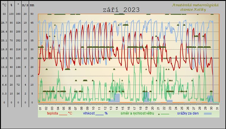 Shrnutí počasí za Košíky ,,září 2023“ Měsíc jako celek na tomto sledovaném místě a za toto období vyšel : teplotně nadprůměrný a srážkově podprůměrný