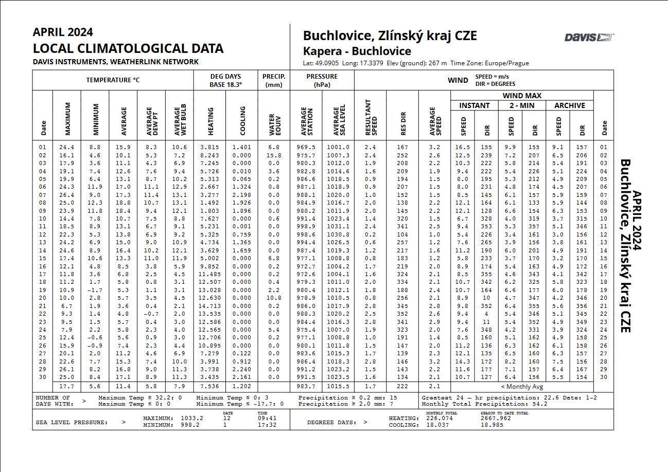 - nejsilnější náraz větru zaznamenán: 14,3 m/s z azimutu 260°(Z) dne 16.4. v 1:47 SELČ