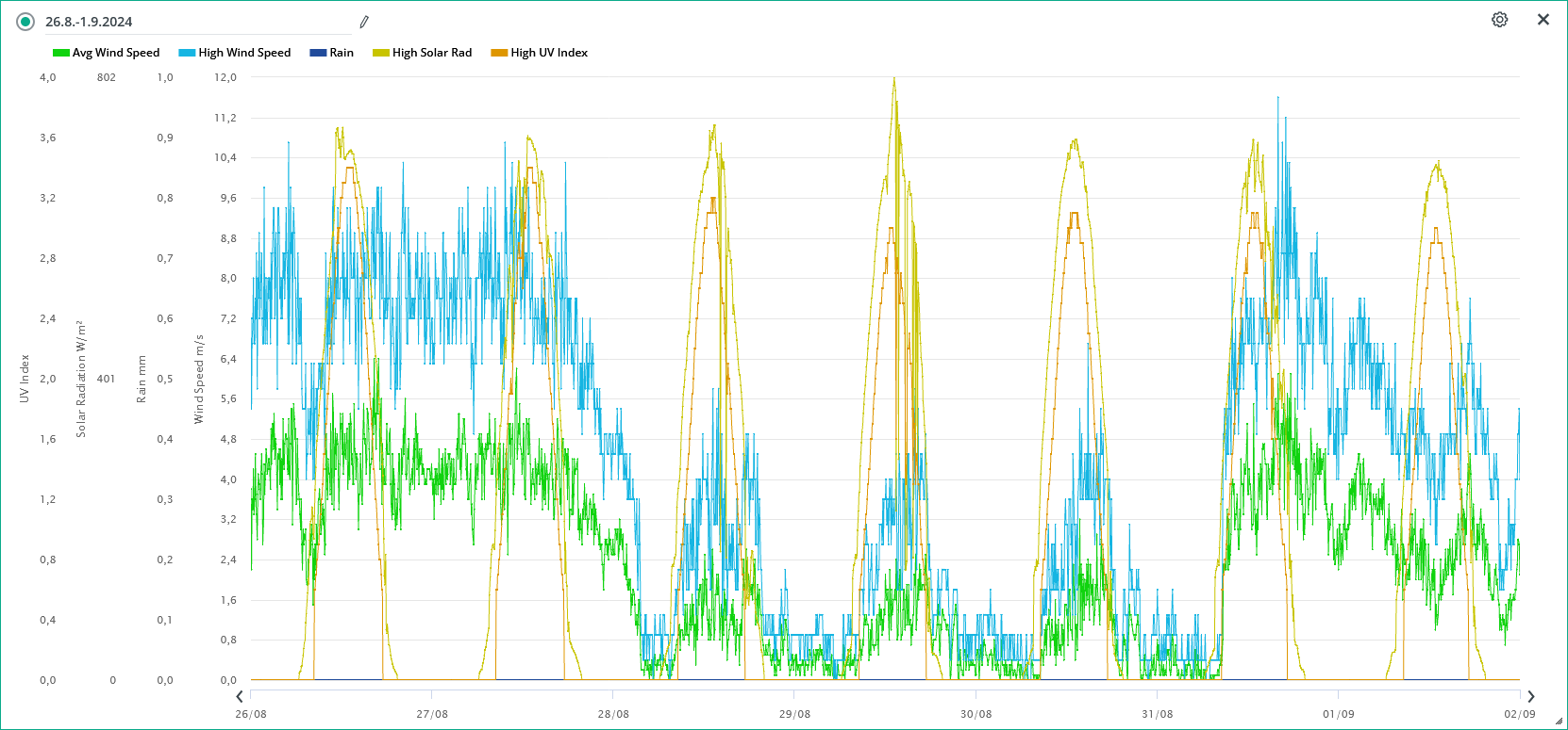 Maximální rychlost(náraz) větru za 24h: 11,2 m/s (31.8.; 17:00) (NNW)
