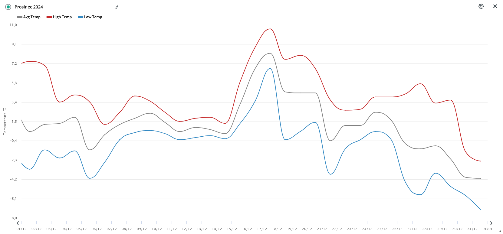 - nejchladnějším dnem byl 29.12. s průměrnou denní teplotou - 3,36°C