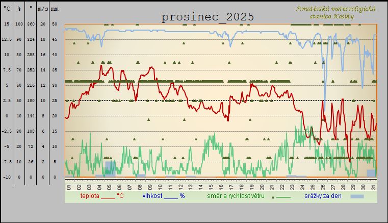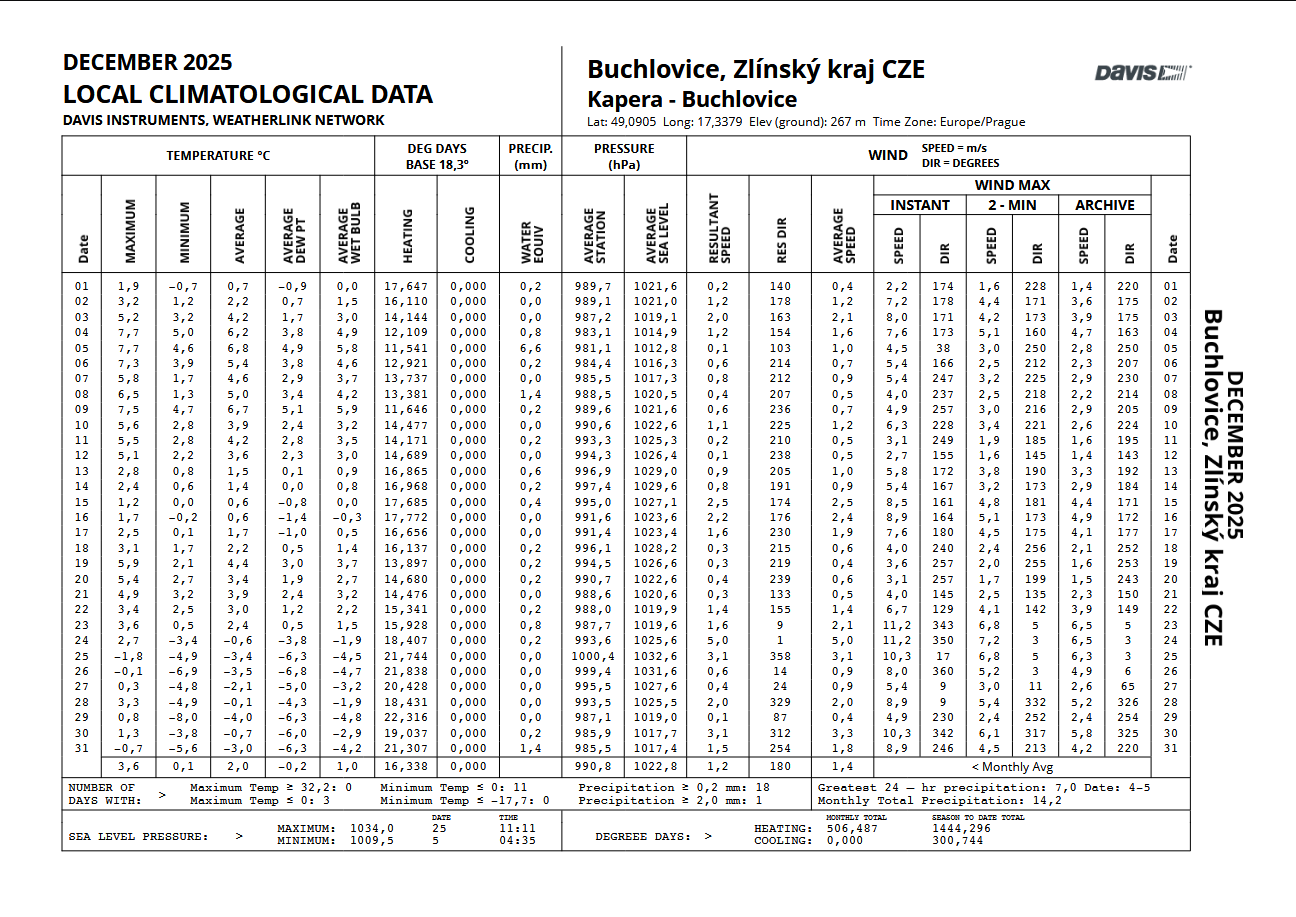 - nejsilnější náraz větru zaznamenán: 9,8 m/s z azimutu 75°(SV) dne 25.12. v 00:10 SEČ