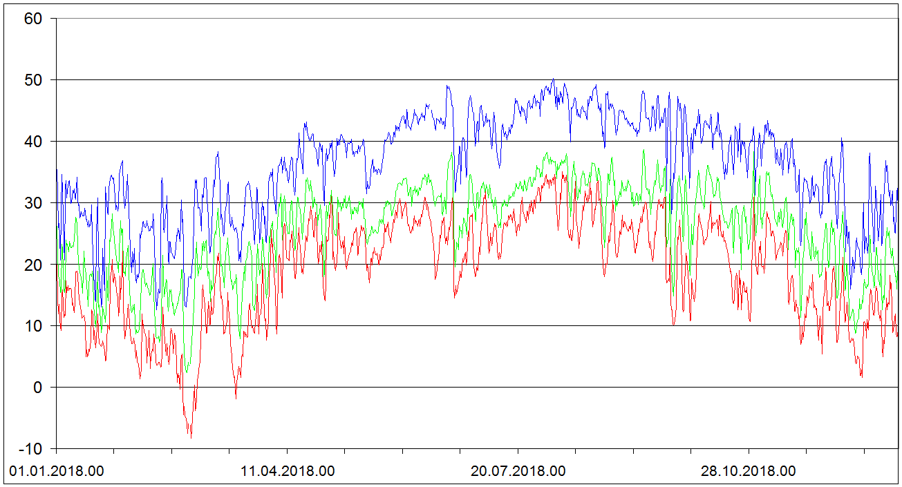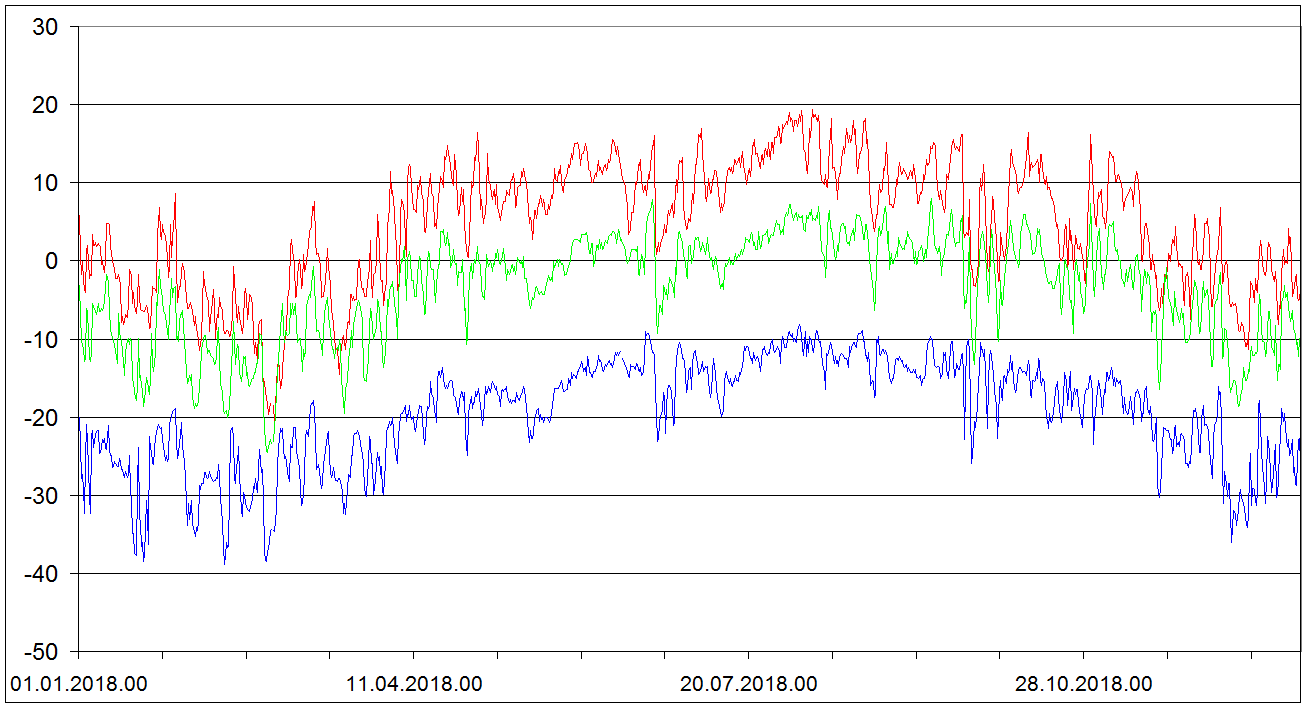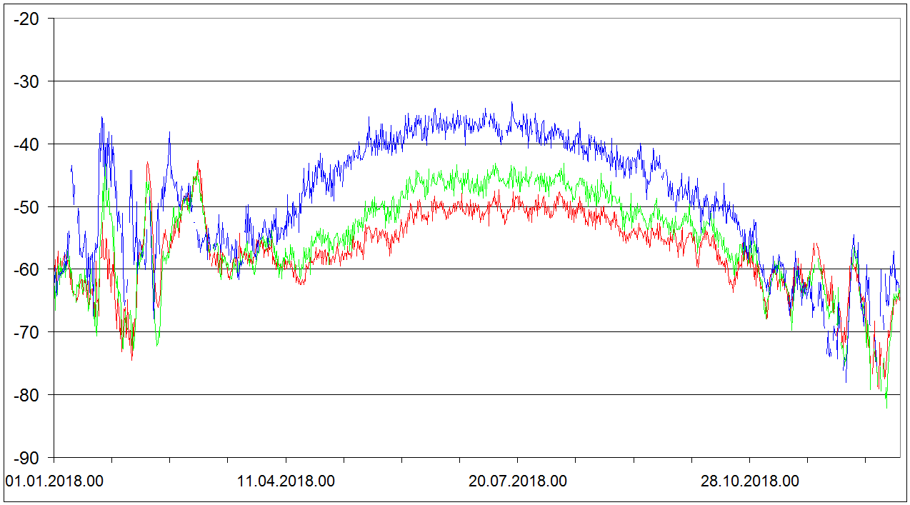 Sondaze Praha Libus 2018 - hodnoty velicin v hladine 850 cervene, 700 hPa zelene, 500 hPa modre. Jedna se o graf ze vsech 1095 sondazi (kazdy den 00 06 12 UTC). V nekterych terminech muzou nektere hodnoty chybet.