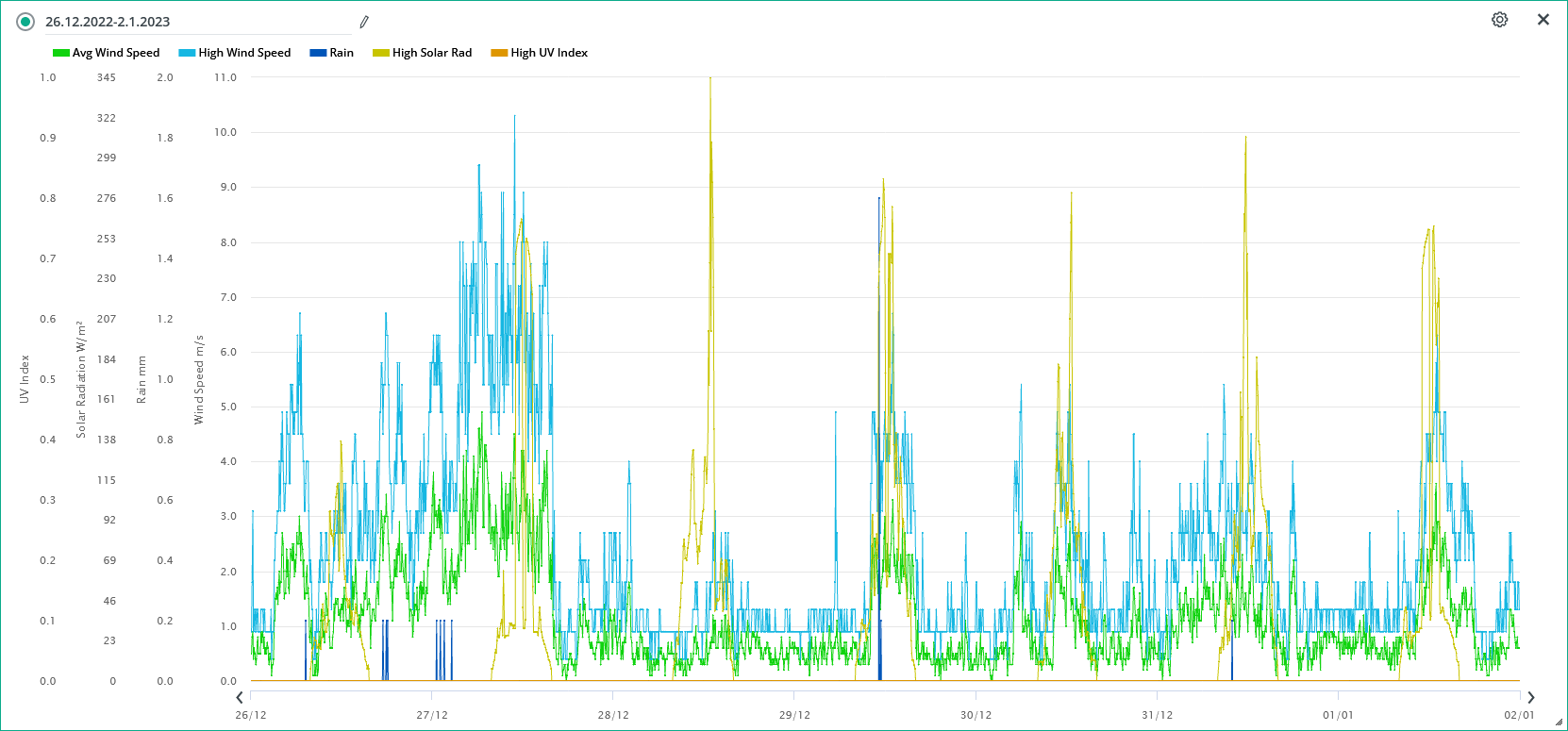 Nejvyšší hodnota solární radiace dnes: 85 W/m2 (12:00)