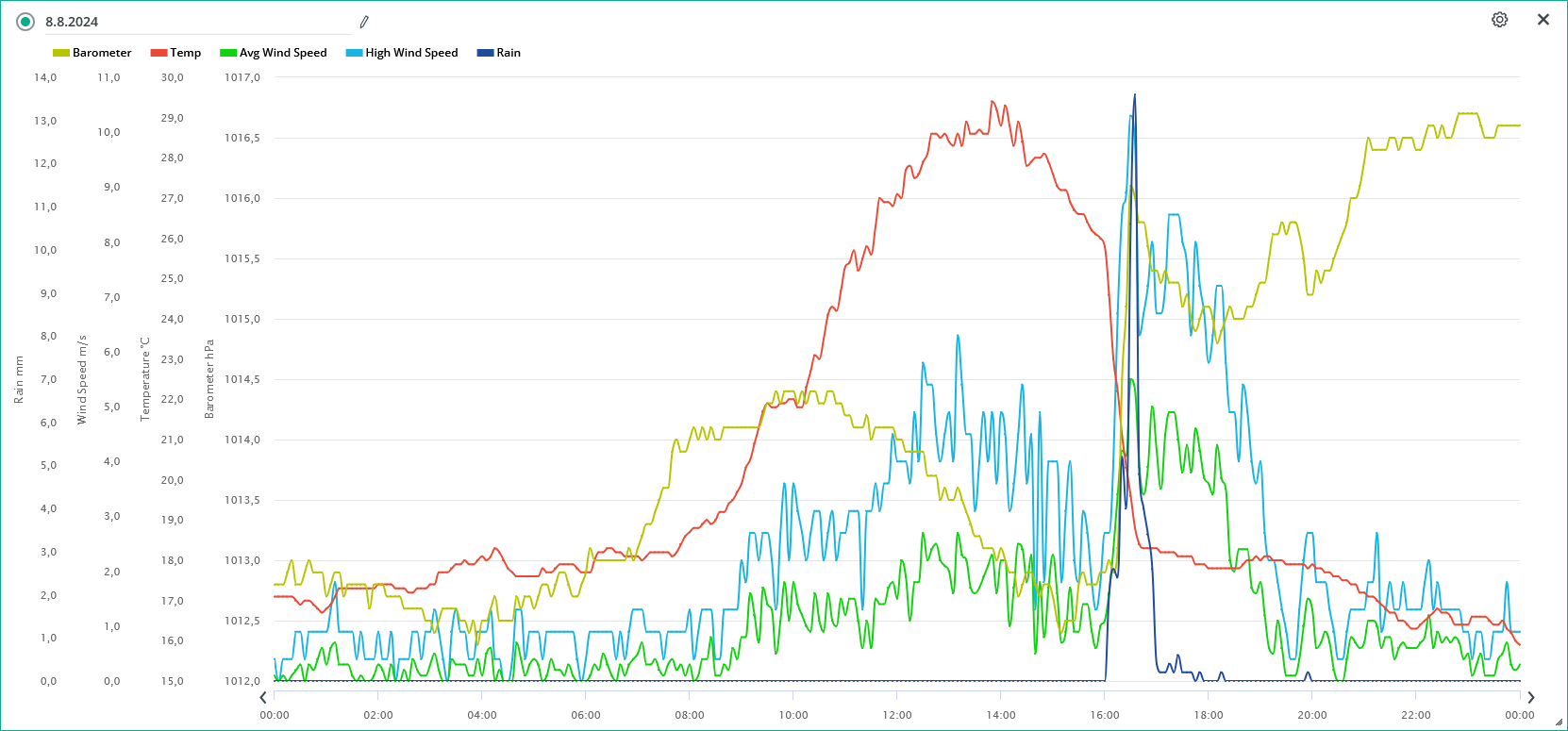 Večer postupně přibývalo vysoké cirrovité oblačnosti. Dnešní den začal zataženou oblohou převážně střední oblačností a slabými srážkami. Oblačnosti ale poměrně rychle ubývalo. Během dopoledne začala narůstat kupovitá oblačnost. Odpoledne dorazily první přeháňky a vzápětí i silné bouřky. Ty přinesly zesílení větru a velké množství deště. Napršelo přes 55 mm za krátkou dobu. Záhy poté se již rozezněly hasičské sirény.. Byl zaznamenán také výpadek připojení k síti.