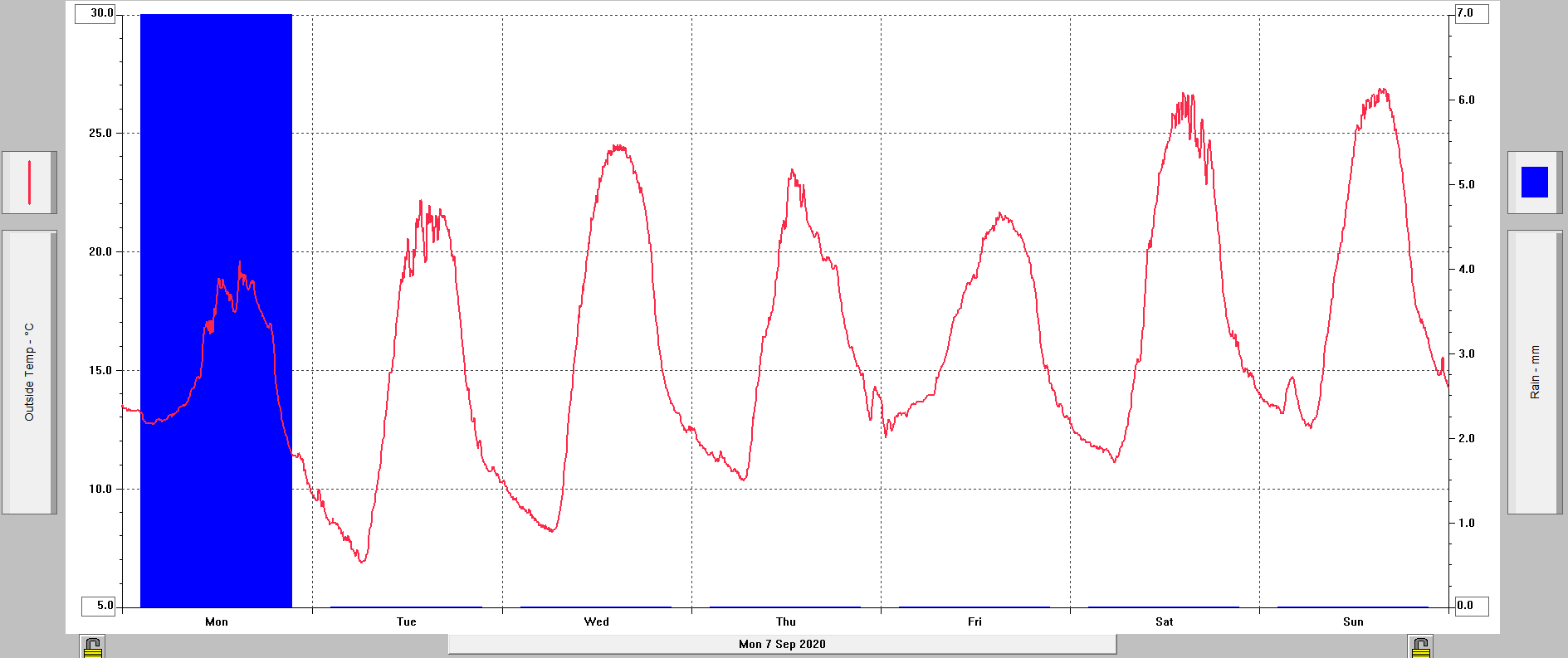 Úterý bylo nejteplejším dnem týdne s maximem kolem 31 °C. Dnes stále teplo, ale maximum již pod 30 °C. Aktuálně je 18,3 °C.