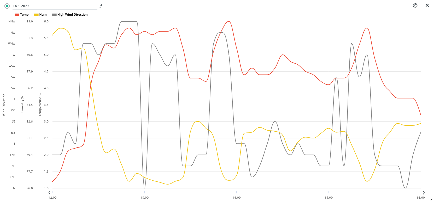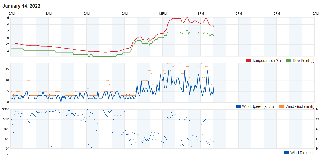 Průměrná rychlost větru 14.1./ max. rychlost.: 4,2 m/s (SSZ)/ 13,0 m/s (ZSZ) 10:20 SEČ