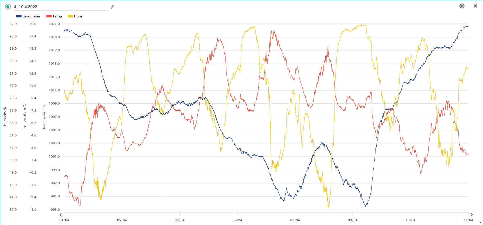 Minimální/maximální tlak 9.4.: 990,2 hPa / 1011,5 hPa