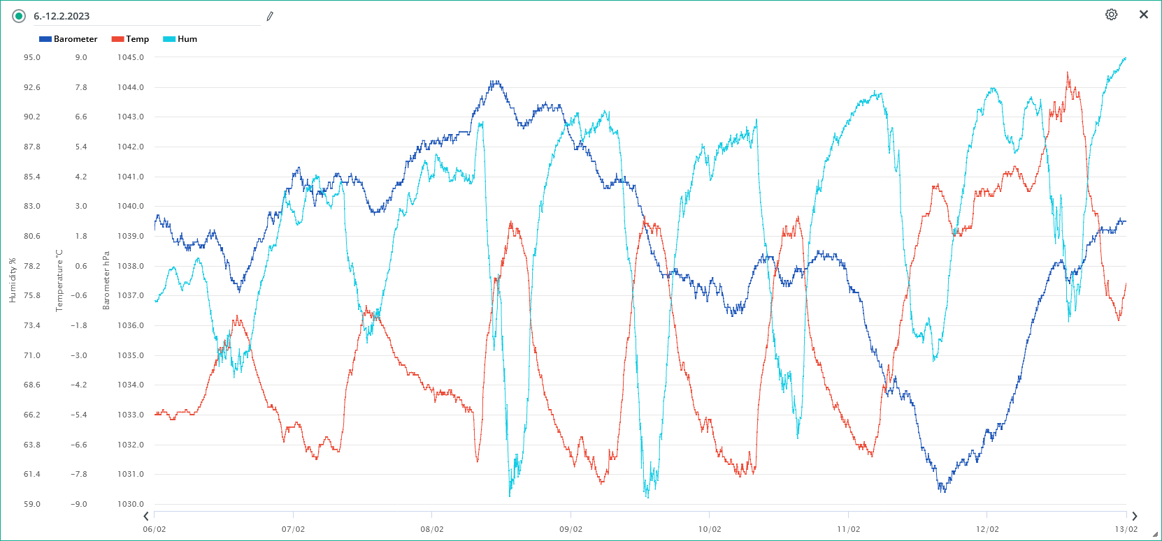 Minimální/maximální tlak 14.2.: 1033,9 hPa /1036,3 hPa