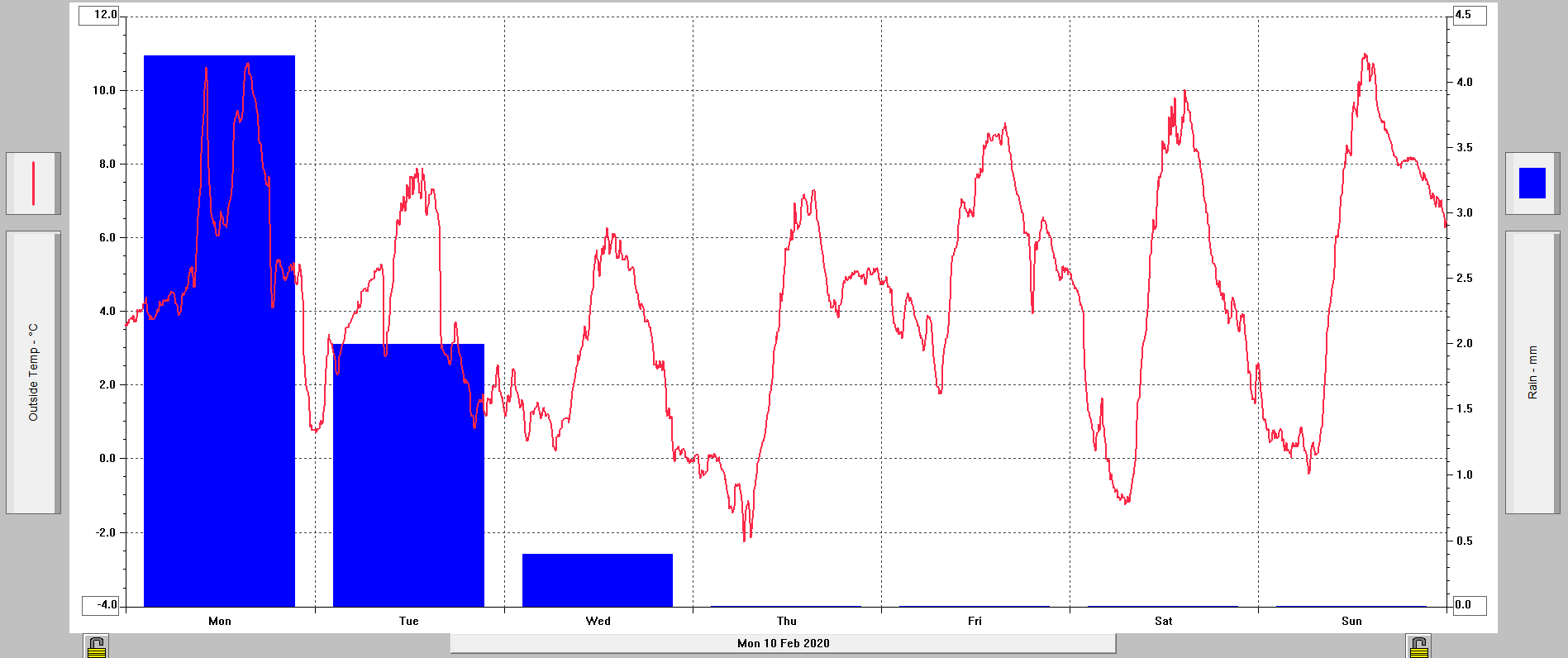 Minimální/ maximální teplota 13.2.: -1,4°C (06:25)/ +4,3°C (12:10)