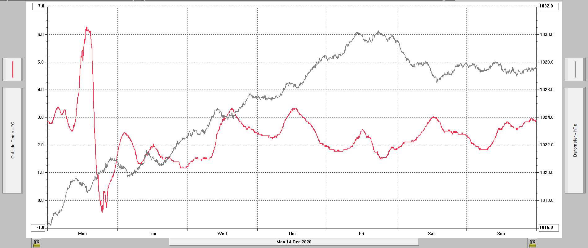 Minimální/maximální tlak 18.12.: 1027,6 hPa / 1030,2 hPa