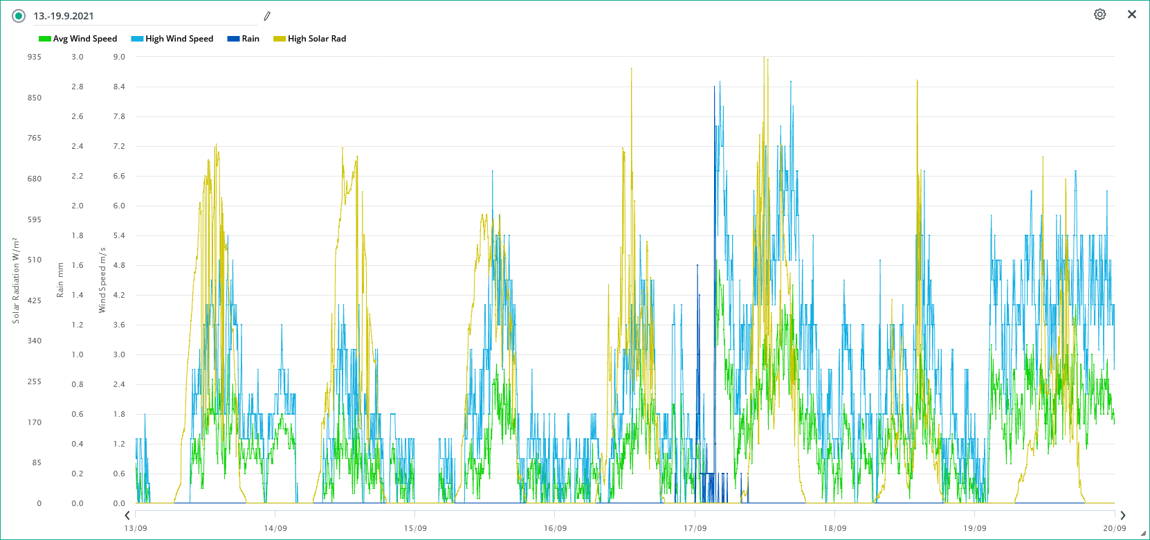 Průměrná rychlost větru 21.9./ max. rychlost.: 1,5 m/s (ZSZ)/ 7,6 m/s (SZ) 17:25 SELČ