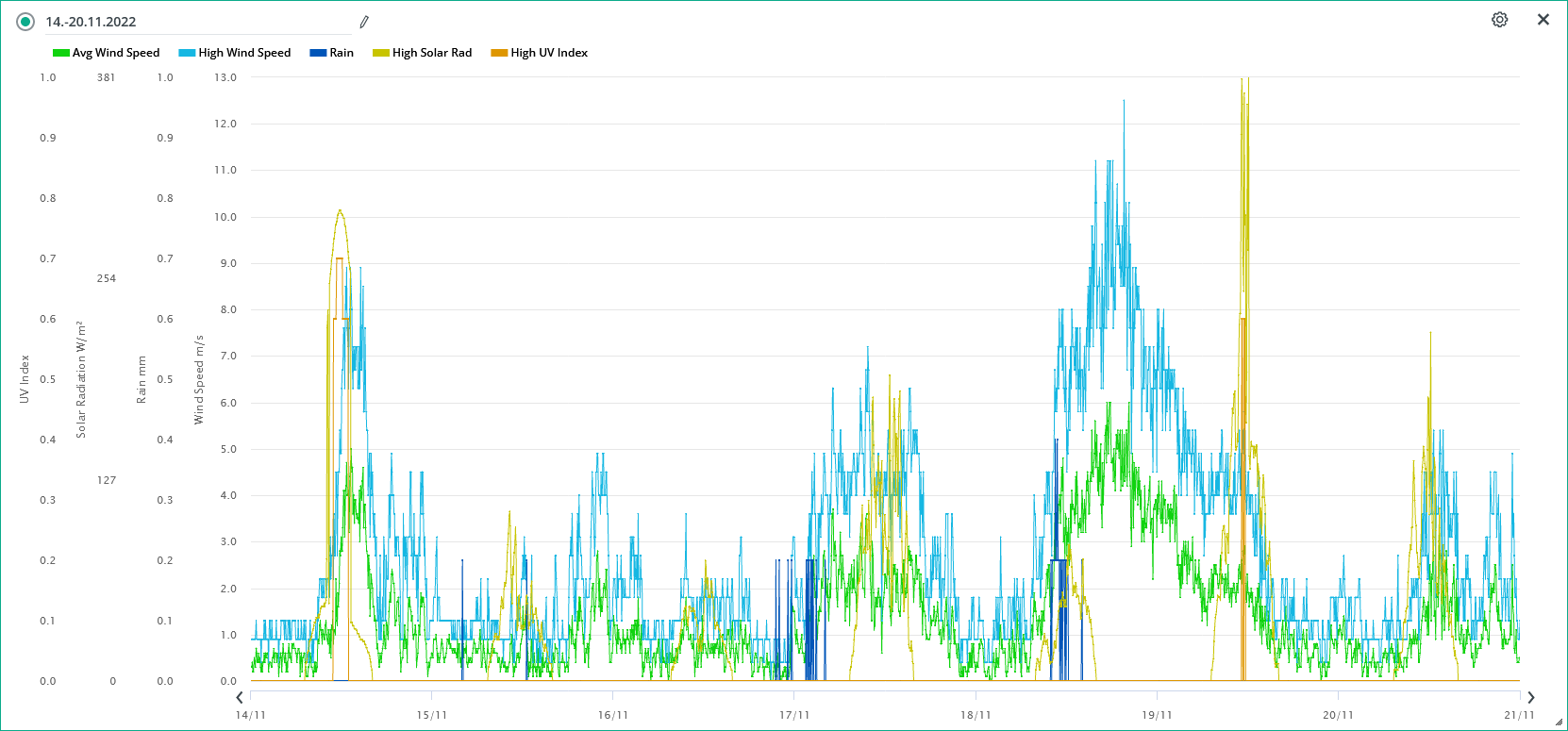 Průměrná rychlost větru 20.11./ max. rychlost.: 0,7 m/s (JJZ)/ 4,0 m/s (JJV) 13:35
