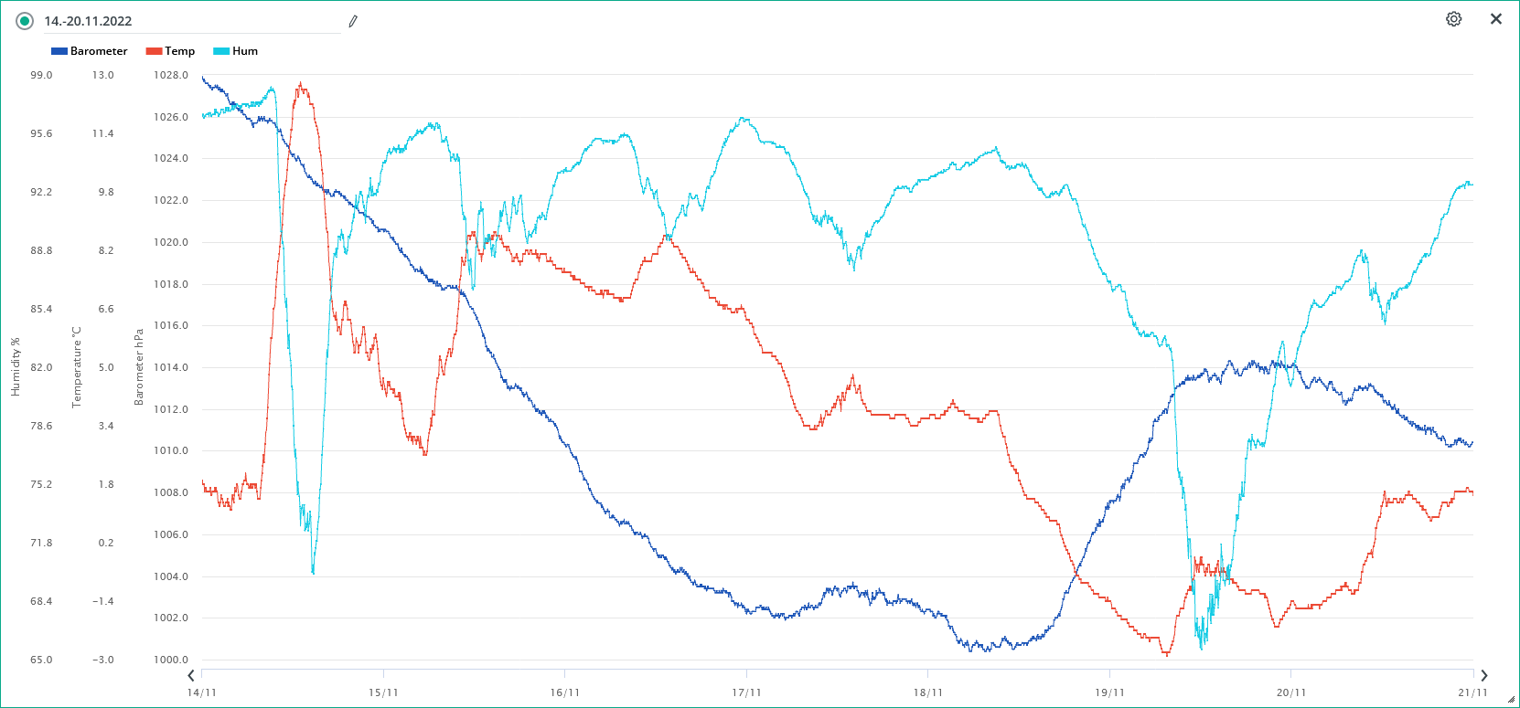 Minimální/maximální tlak 17.11.: 1001,9 hPa / 1003,7 hPa