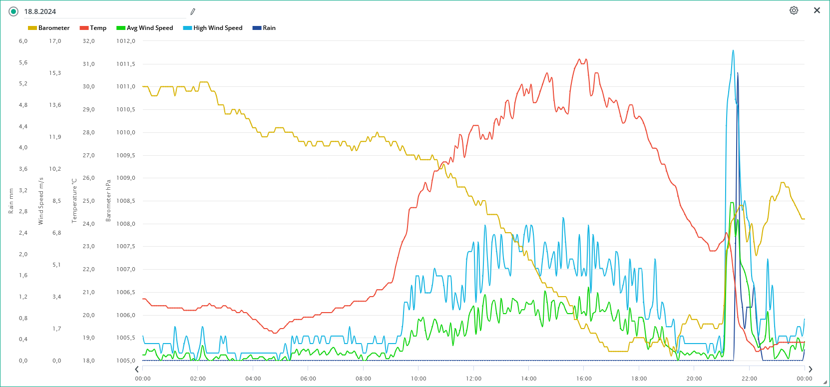 Včerejší večer již přinesl silnější bouři. Ta se projevila silnějším deštěm a zejména větrem. Viz přiložený graf. Zpočátku se jednalo o blýskavici na západě a jihozápadě. Postupně s blížící se bouřkou bylo slyšitelné i hřmění. Před samotnou bouřkou se ještě vyskytla húlava (poslední dobou poměrně vzácný jev).