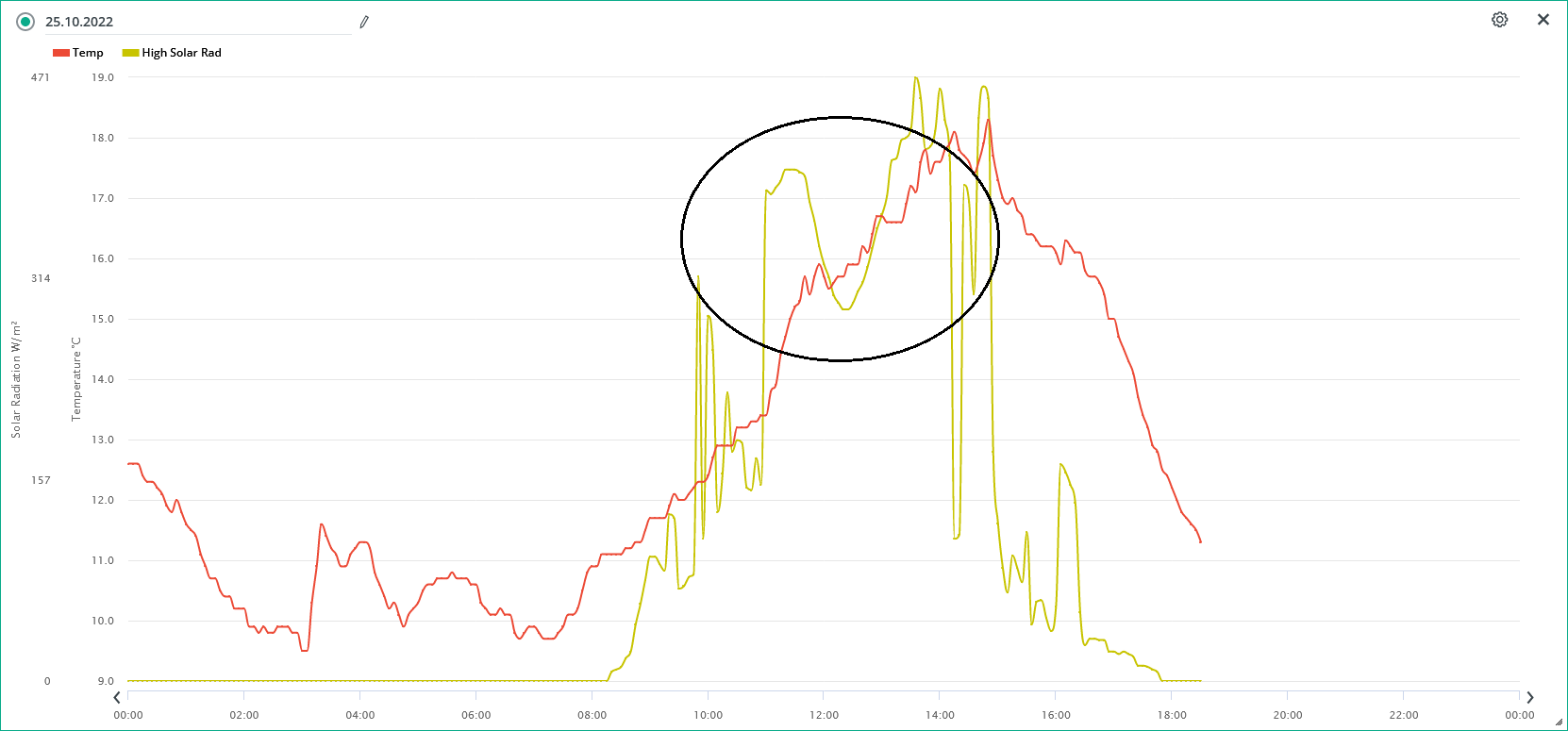 Nejvyšší hodnota solární radiace dnes: 492 W/m2 (11:05)
