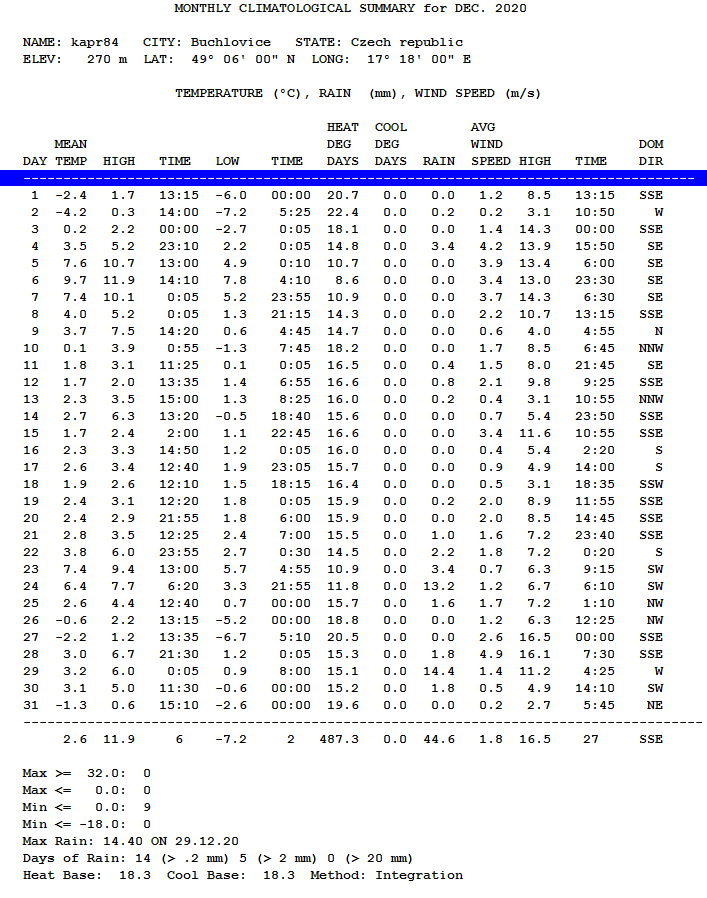 TommyAst píše: ↑09 pro 2020, 16:44 Mesicni prehled stanic Ogimet SYNOP v CR a par stanic v Evrope Prosinec 2020 (31 dni 01-31.12.2020 23 UTC):