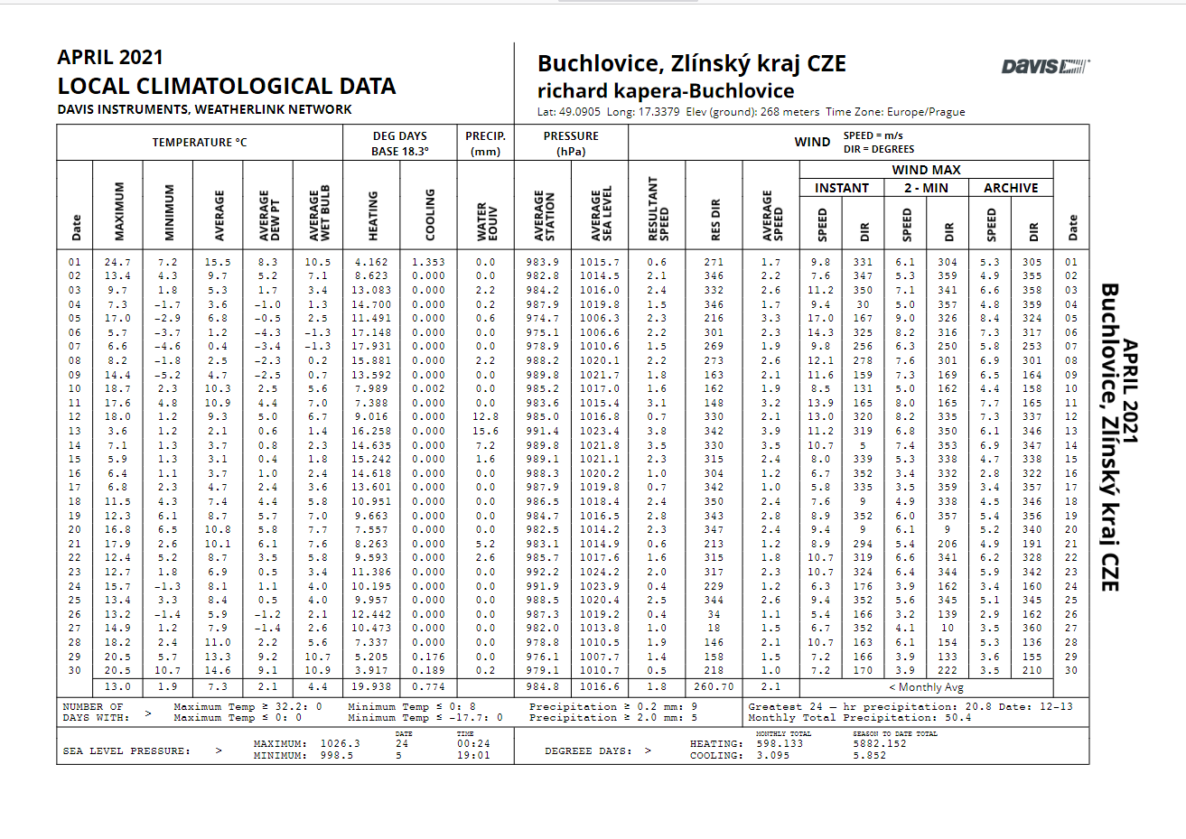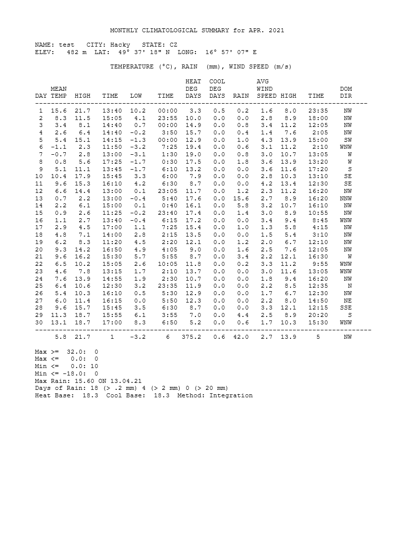 - nejsilnější náraz větru zaznamenán: 13,4 m/s z azimutu 288°(Z) dne 5.4. v 16:02 SELČ