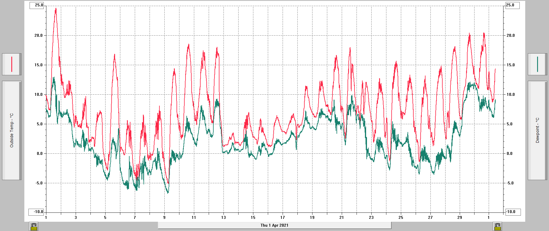- maximální tlak 1027,5 hPa (13.4. v 11:04), minimální tlak 997,9 hPa (5.4. v 15:34)