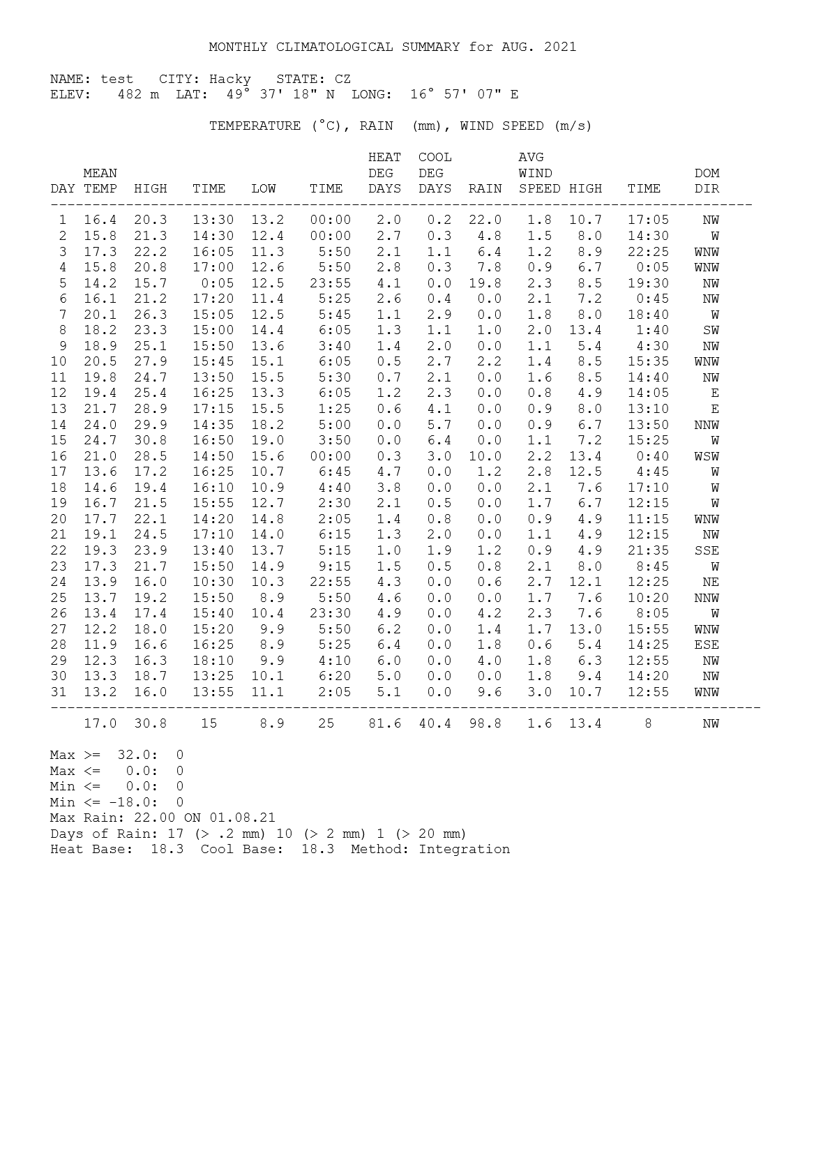 Nejvyšší minimum: 17,3 °C (15.; 05:35 selč)
