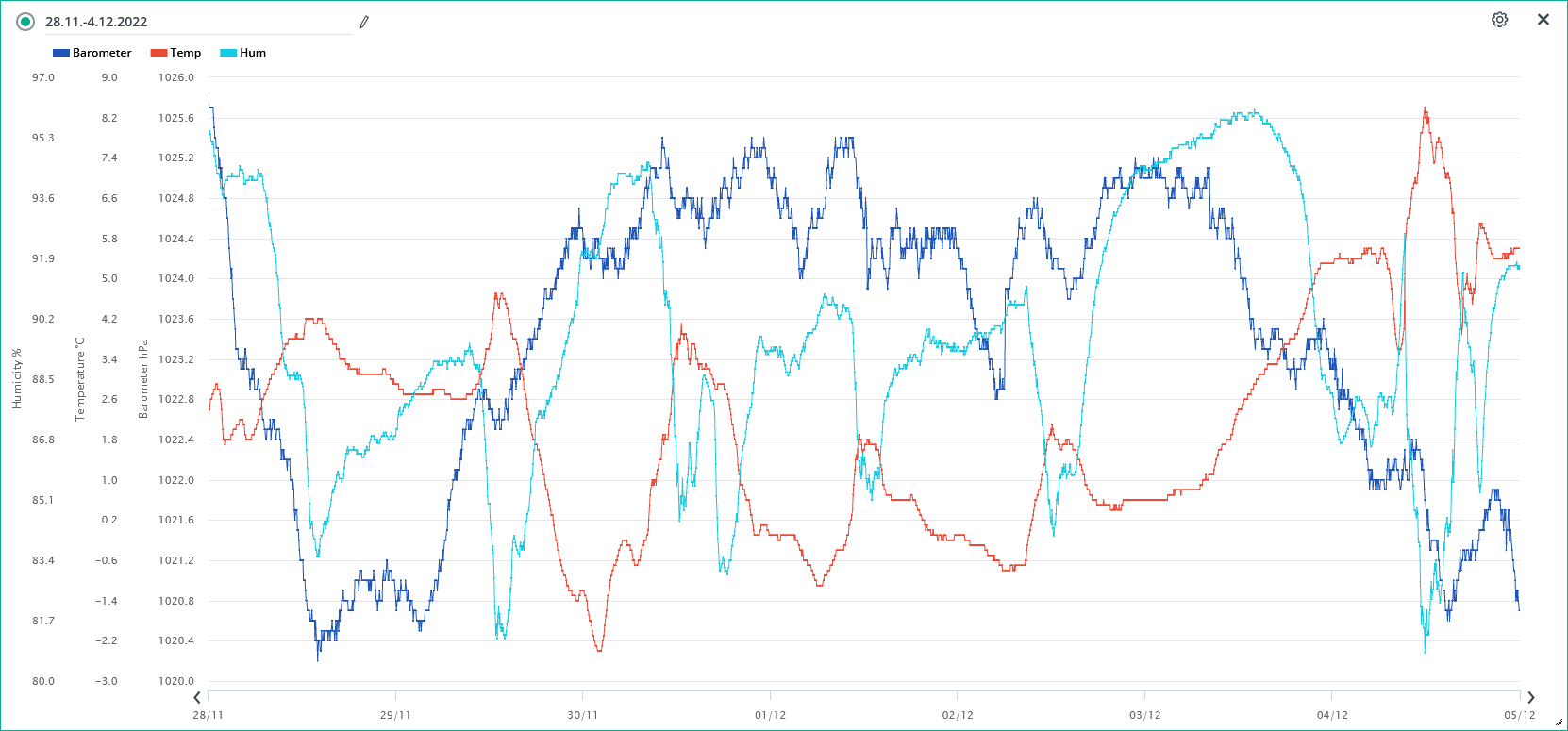 Minimální/maximální tlak 30.11.: 1023,4 hPa / 1026,2 hPa
