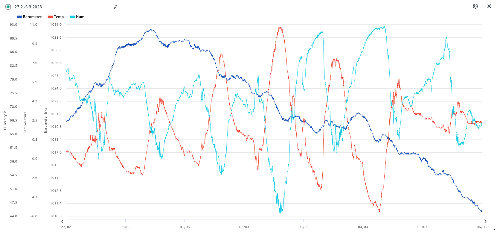 Maximální tlak za 24h: 1029,4 hPa (28.2.; 23:50)