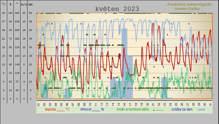 - průměrná vlhkost vzduchu z minutových měření byla v květnu 74 %
