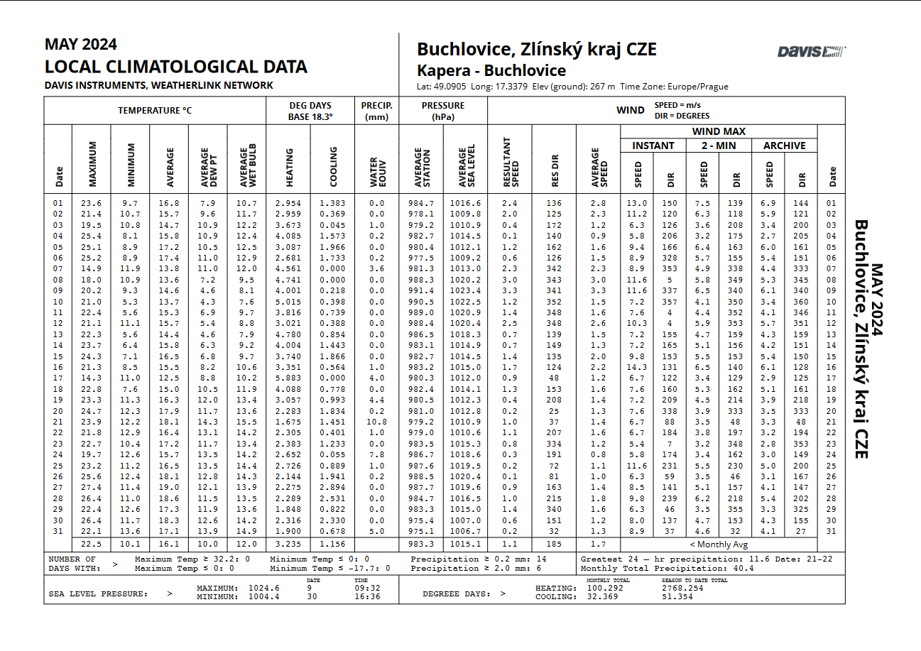 - absolutně nejnižší teplota byla dosažena dne 13.5. + 2,3°C v 5:31 SELČ