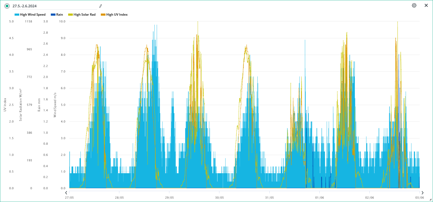 Maximální rychlost(náraz) větru za 24h: 8,9 m/s (31.5.; 17:00) (37°),