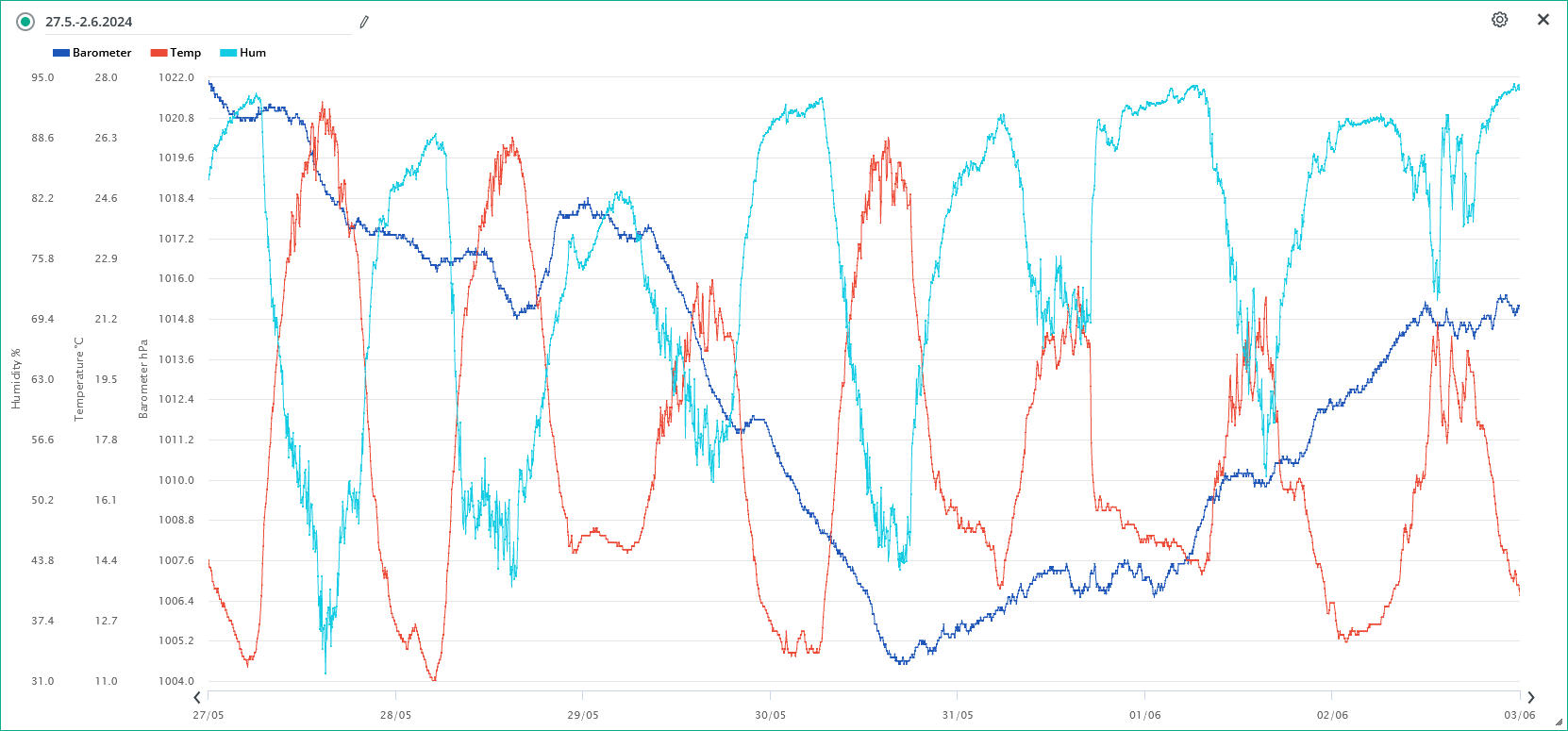 Minimální tlak vzduchu na stanici za 24h: 975,0 hPa (31.5.; 18:50)
