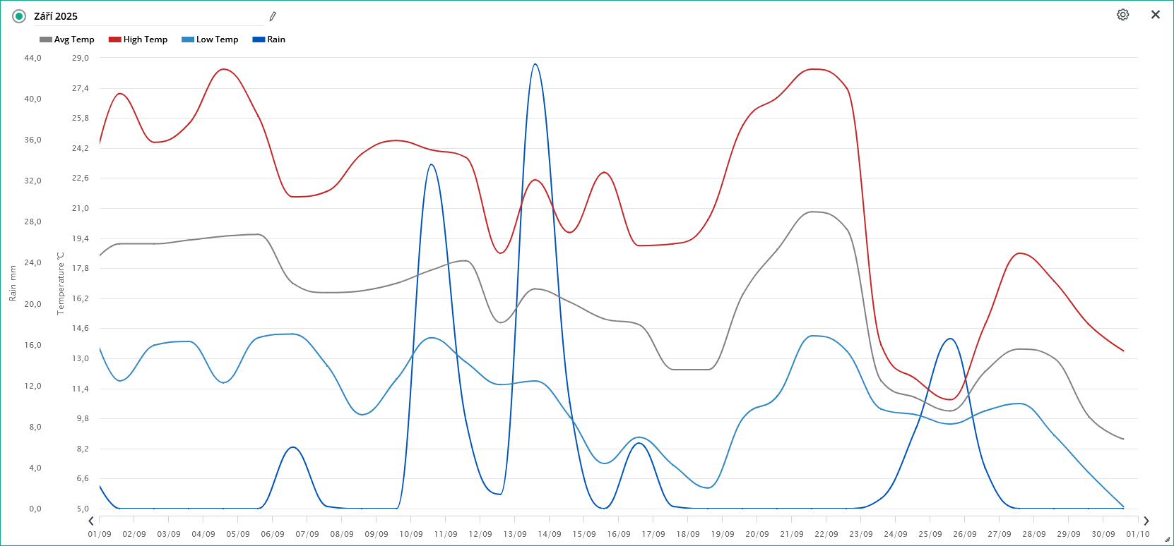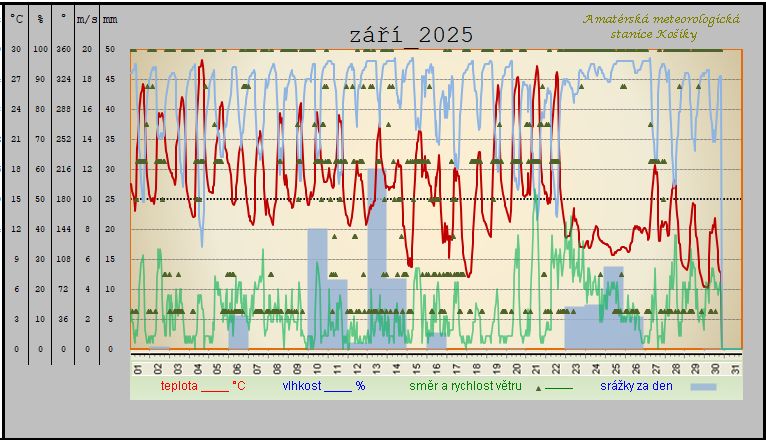 Shrnutí počasí za Košíky ,,září 2025“ Měsíc jako celek na tomto sledovaném místě a za toto období vyšel : teplotně i srážkově nadprůměrný