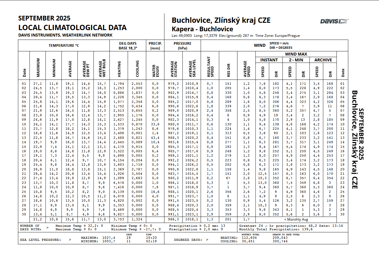 - nejsilnější náraz větru zaznamenán: 10,7 m/s z azimutu 80°(V) dne 25.9. v 8:12 SELČ