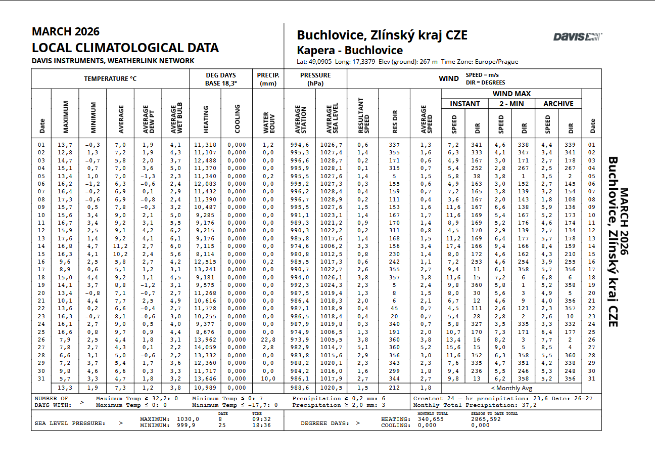 - absolutně nejnižší teplota byla dosažena dne 6.3. - 4,7°C v 6:12 SEČ
